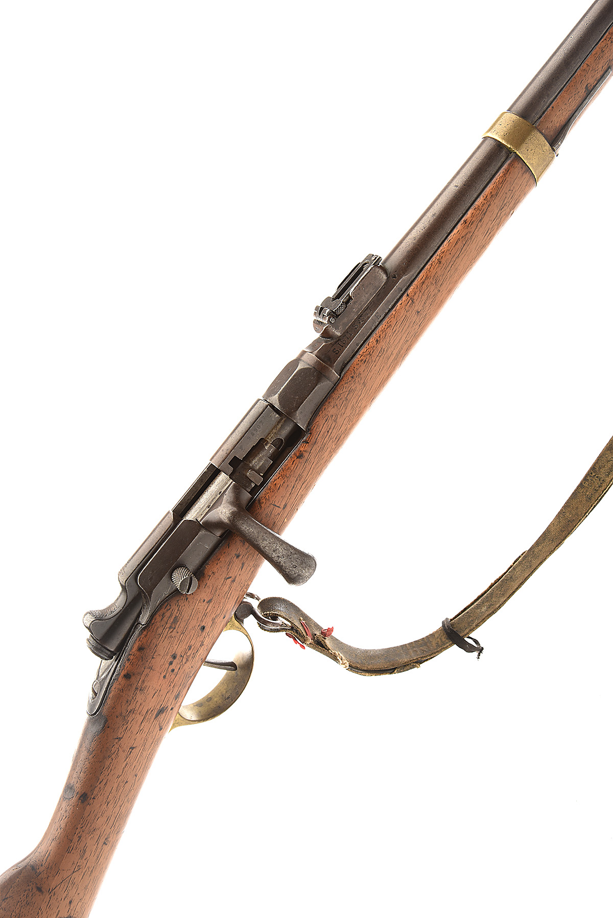 A RARE 11mm FRENCH GRAS CADET BOLT ACTION SINGLE SHOT CADET RIFLE SIGNED ST ETIENNE, serial no. F98907, circa 1880, with 27 1/2in. barrel having a block and blade front-sight and reduced proportion ladder rear-sight, the action stamped "ST. ETIENNE MLE 1886-74 / M80", regulation iron mounted full walnut stock with two barrel bands, the rifle is complete with its sling swivels, and rod. Barrel, action and bands to a smooth grey / brown patina, the stock with wear and some worm. These Gras cadet rifles were made in relatively small numbers consequently are very rare today.