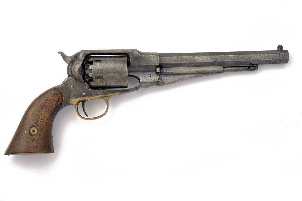 A REPRODUCTION .44 PERCUSSION REVOLVER SIGNED NAVY ARMS, MODEL 'REMINGTON ARMY', serial no. 14059, with octagonal 8in. barrel, solid frame, plain cylinder and smooth walnut grips, finish worn