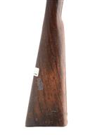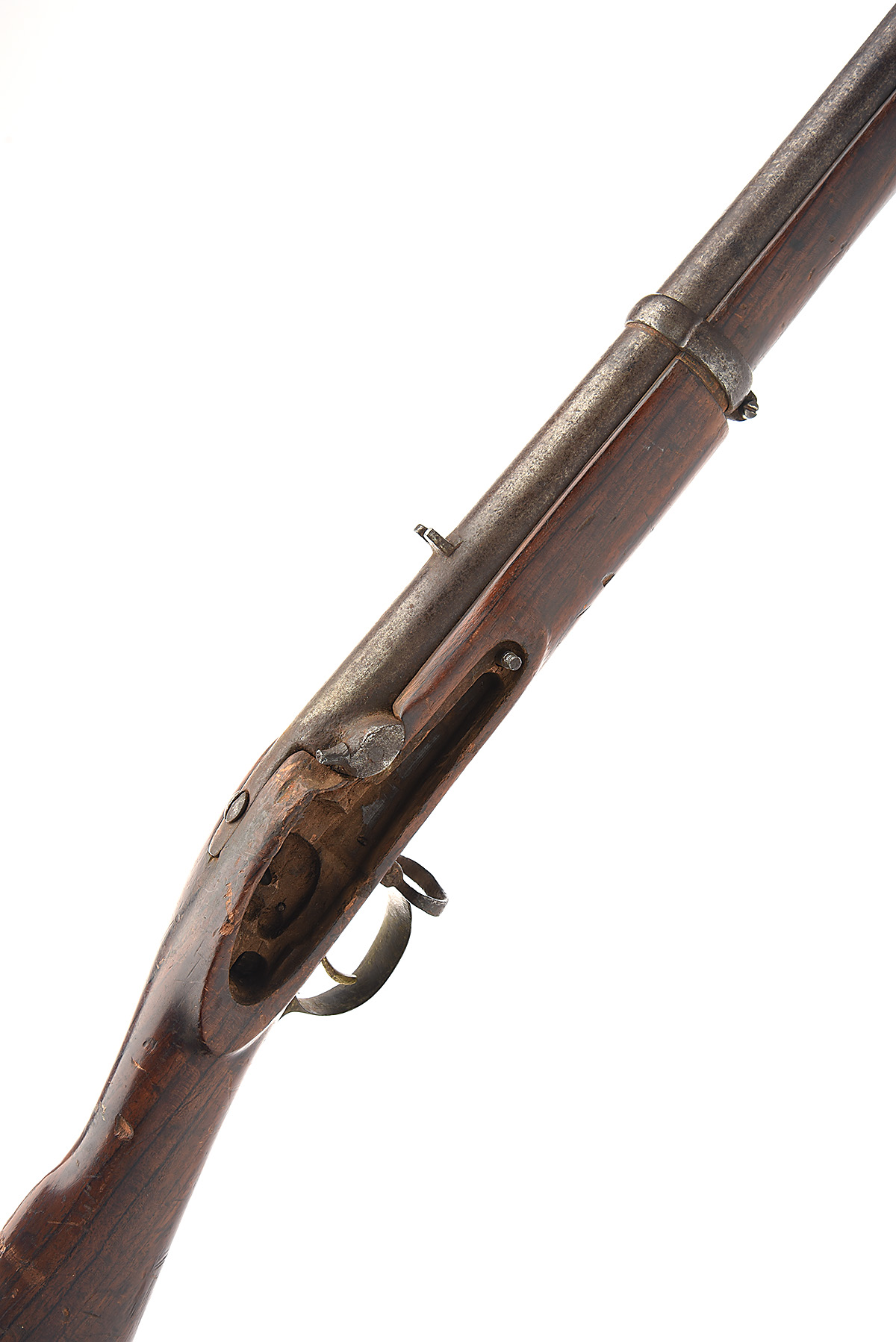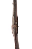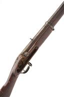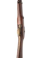 A .650 PERCUSSION TWO BAND INDIA PATTERN CARBINE MAJOR PARTS no visible serial number, circa 1870, 19 1/2in. barrel with blade front-sight, fixed vee block rear-sight, lock missing, full walnut stock with brass mounts, including a crude sheet metal butt plate, small circular patchbox, trigger-guard and nose-cap, two barrel bands. For parts or repair. barrel to grey / brown patina, T