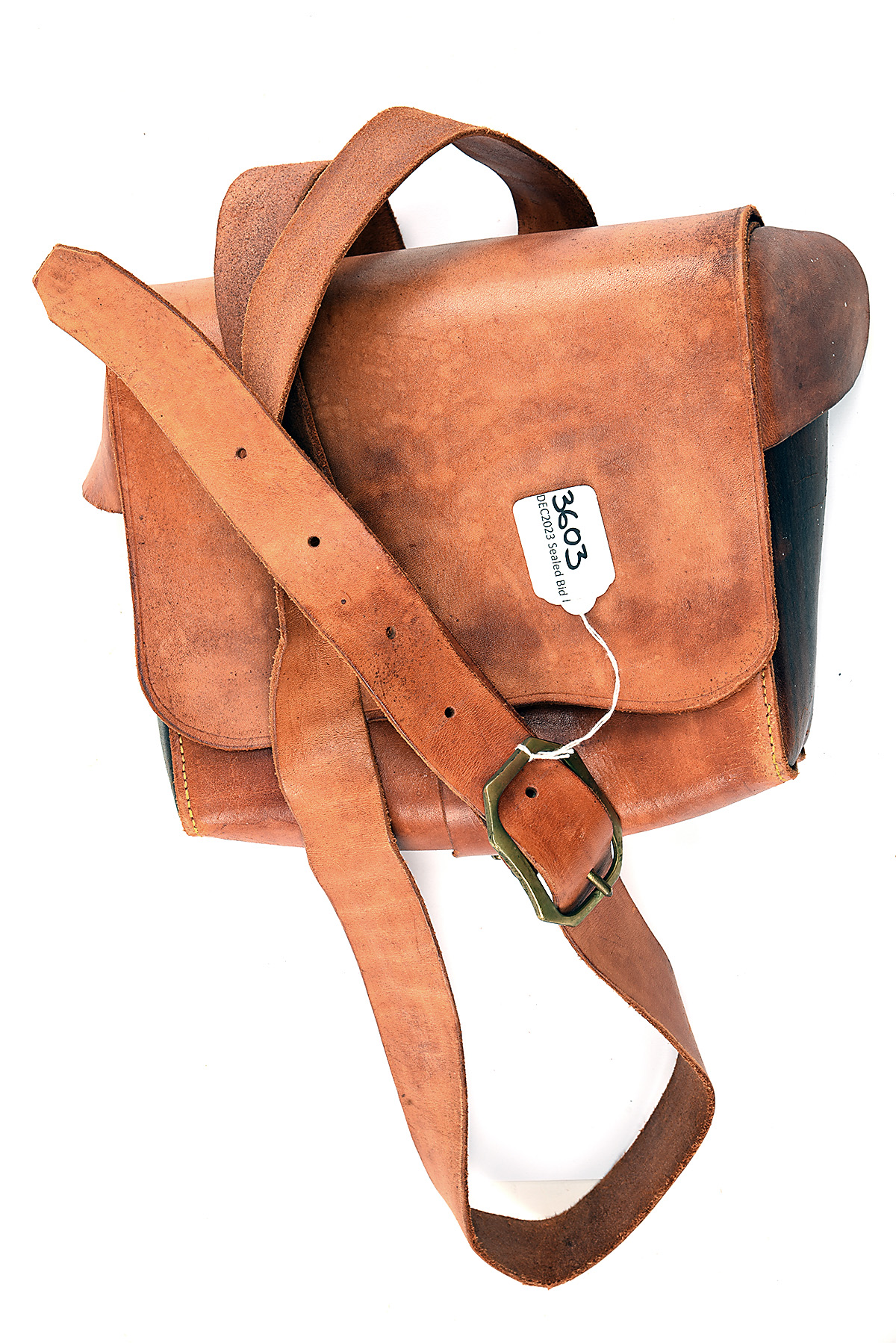 SOFT LEATHER CARTRIDGE MAGAZINE, tan leather including shoulder strap, brass fittings, unlined, double top flap cover with single fastening stud, to hold approx. 75 cartridges up to approx. 3in. length, approx. external dimensions, 3 1/2in. x 9in. x 10in.
