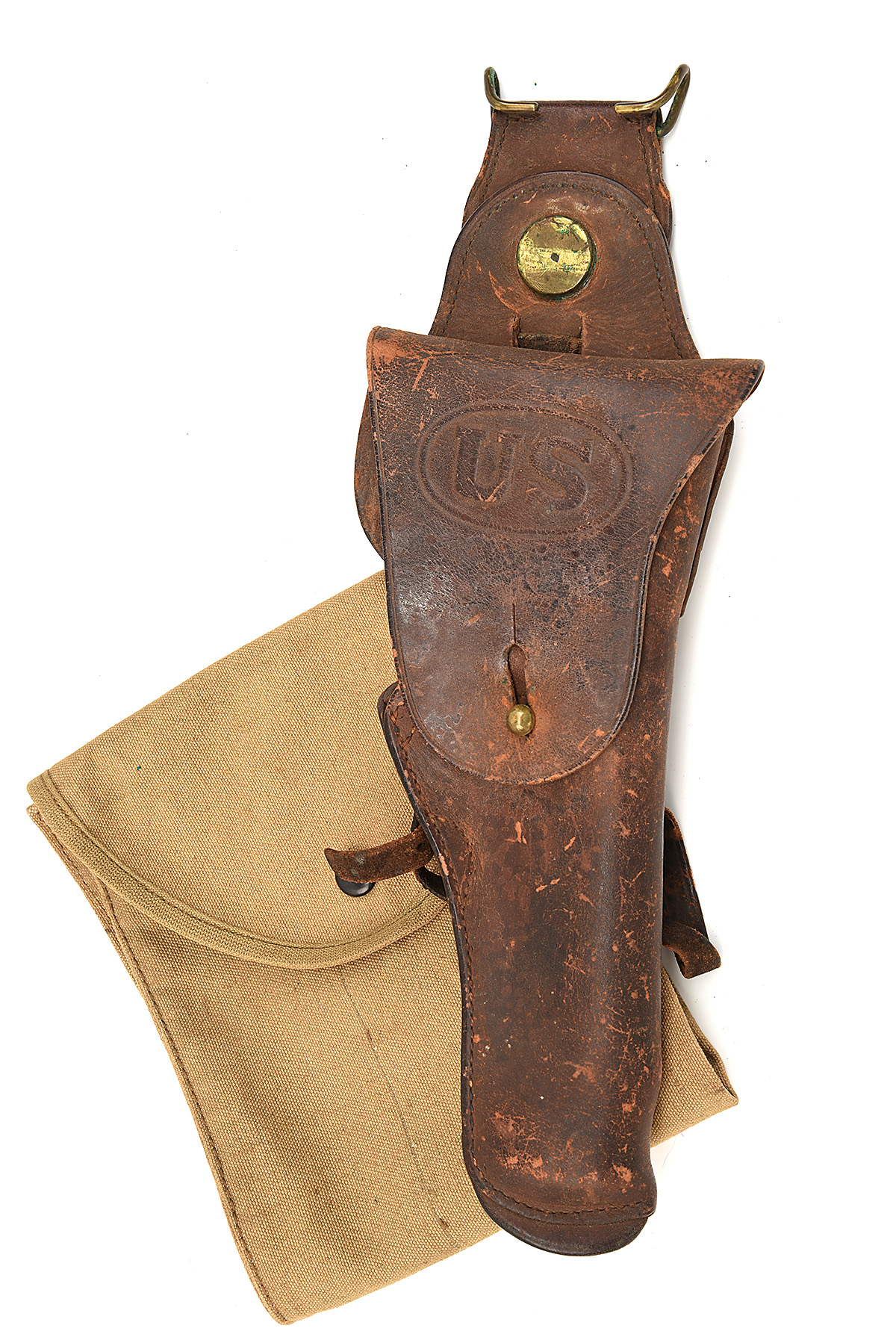 A RARE UNITED STATES MODEL 1912 CAVALRY HOLSTER, circa 1917, brown leather with impressed 'U S' oval cartouche on flap, some grazing and leather dry but no tears or splits and stitching sound, original strap badly worn and missing its buckle, together with a modern canvas cover