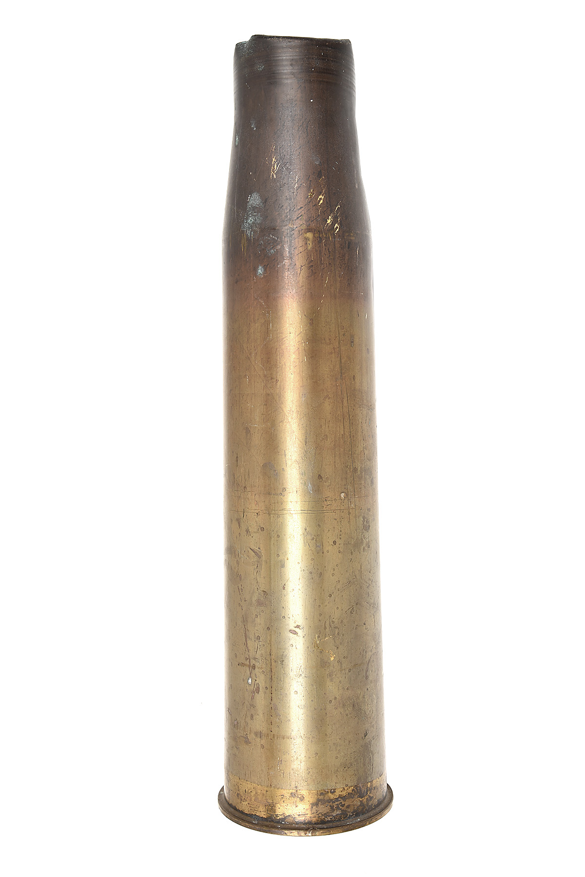 A NAVAL ARTILLERY 4.5 IA BRASS SHELL CASE, circa 2000, complete with fired fuse, faded black stenciling on base, 27 1/2 in. overall