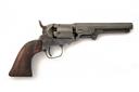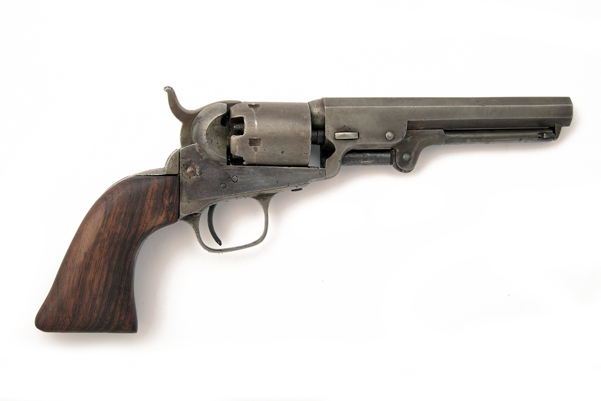 A UNITED STATES .31 PERCUSSION COLT MODEL 1849 LONDON 'POCKET', serial number 1942, 1850, with 5 in octagonal barrel, top flat marked 'ADDRESS COL. COLT / LONDON'. 5-shot cylinder, open steel frame with London proofs, under-barrel rammer, wooden grips, together with a black leather holster, visible serials are matching, heavily worn, scrubbed of all finish, traces of frame script only, no visible cylinder scene, front sight filed down, action at fault, replaced grips, 12 in. overall with holster