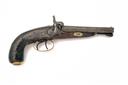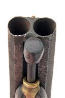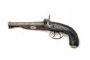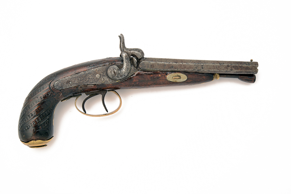 A CONTINENTAL 40-BORE BACK-ACTION SIDE-BY-SIDE PERCUSSION PISTOL, UNSIGNED,no visible serial number, circa 1830, probably French, with 5 1/2 in. octagonal sighted steel barrels, locks and hammers with scroll-work, wooden stock, decorated brass furniture, butt-cap with trap, iron rammer with wooden tip, worn, actions weak, all non-brass metalwork heavily pitted, stock with chips and varnished, trigger-guard replaced, 11 in. overall