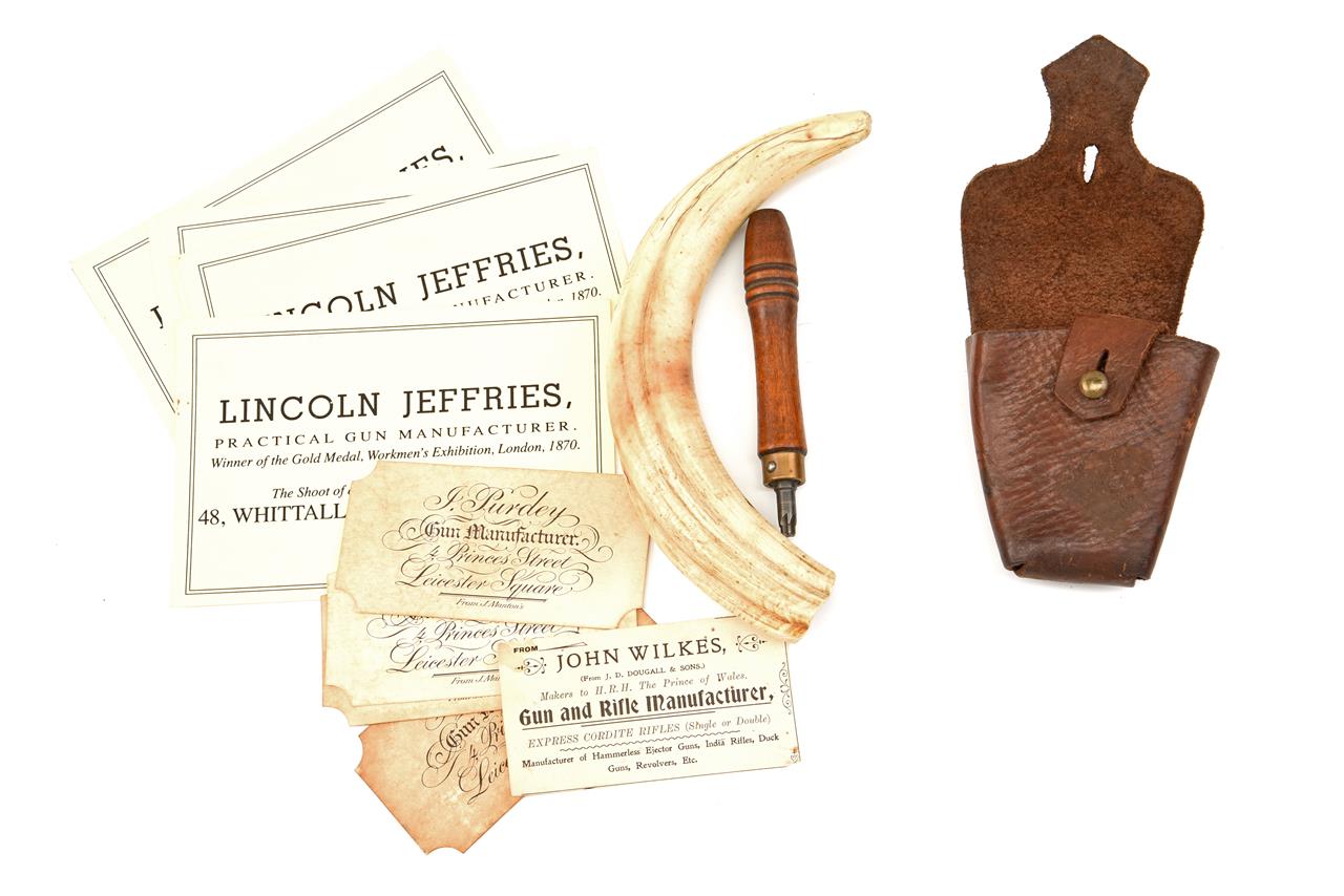 A WARTHOG TUSK, A POCKET REAMER, A CLIP POUCH, AND COLLECTION OF CASE LABELS AND CARD ADVERTS, 1) tusk with some chipping at tip, 7 1/2 in. when measured straight; 2) reamer with walnut handle, 4 1/2 in.; pouch brown leather cut from a bandolier; 4) labels presumed reproductions, 9x Lincoln Jeffries, 4x Purdey and a John Wilkes