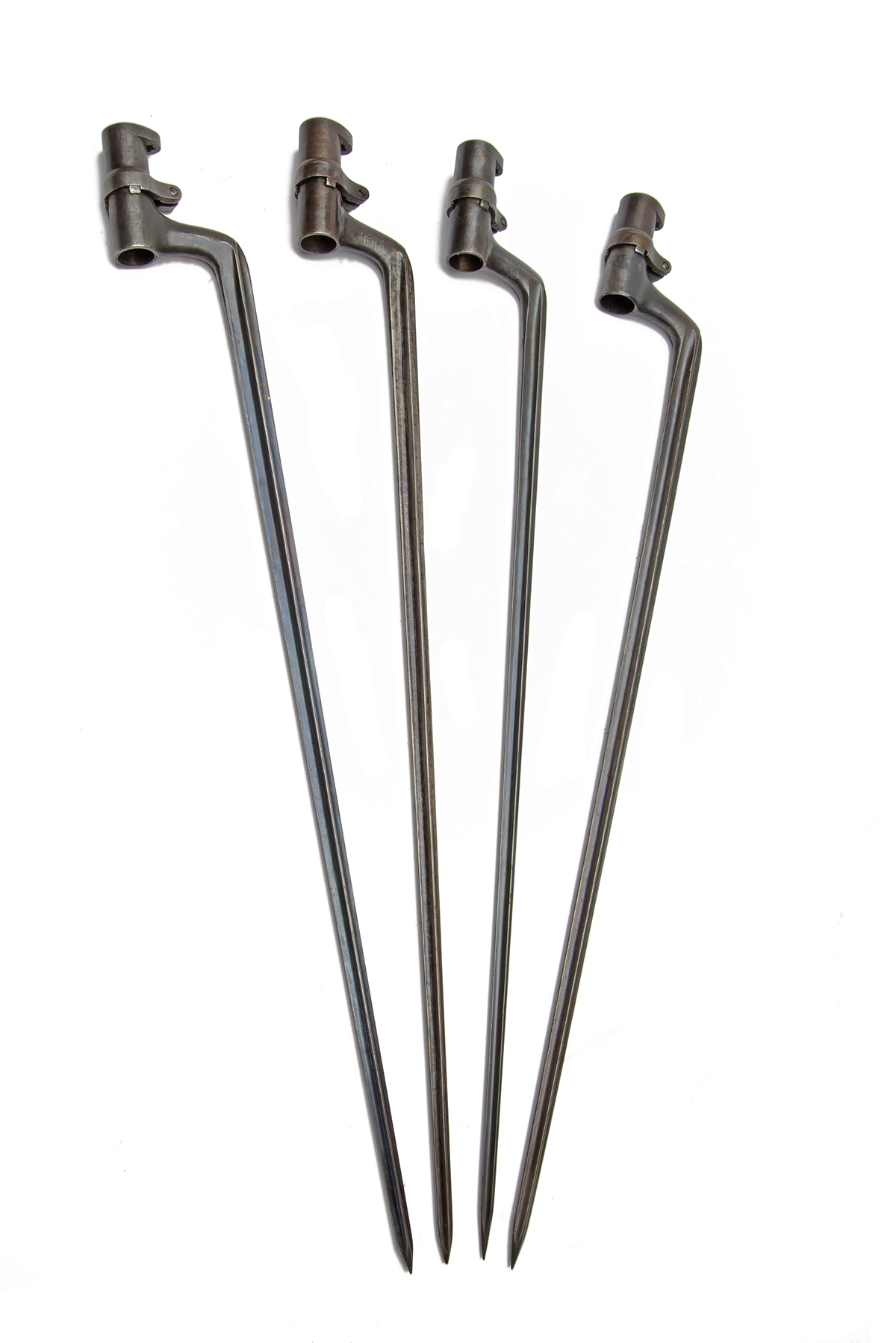 A GROUP OF FOUR SWISS SOCKET BAYONETS FOR THE 10.4 mm MODEL 1871 VETTERLI RIFLE, late 19th Century, 19 1/2 in. cruciform blade, all complete with locking ring, inspection marks on elbows, numbered '4520', 1421', '345', and '57714', a little staining but otherwise good and clean, each 22 in. overall