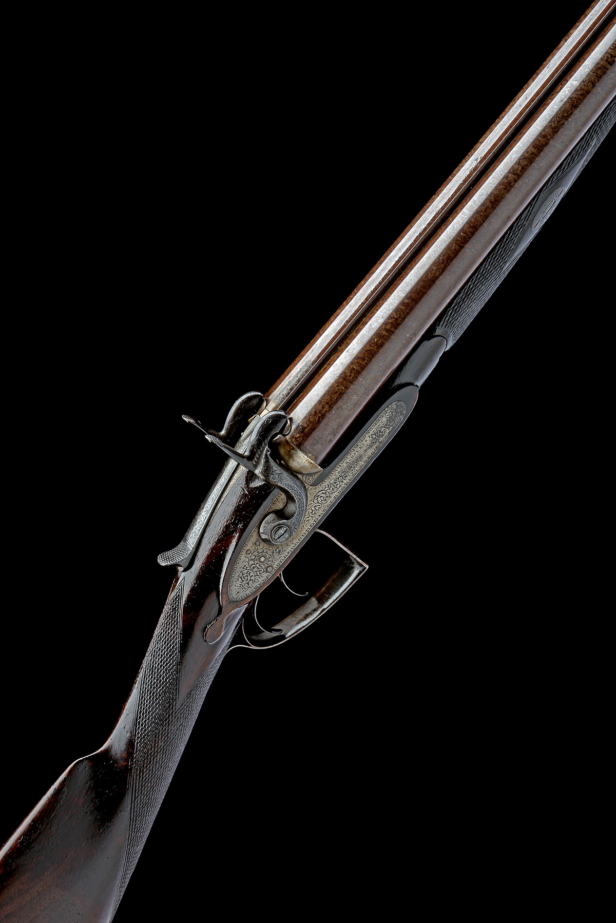 for 1863, 31 1/2in. bold damascus barrels, rib engraved 'THOMAS HORSLEY. MAKER. YORK. PATENT NO. 72.', 2 1/2in. chambers, bored approx. true cyl. in both, right wall at 19, extractor with provision to withdraw pinfire cartridges, Horsley No.2 patent pull-back toplever, patent no. 2410 of 1st October 1863, use no. 72, non-rebounding sidelocks with dolphin hammers of pinfire form, vertical fronted triggerguard of No.1 patent form, bar-in-wood, best bold scroll engraving, retaining traces of original colour-hardening and renewed finish, 14 5/8in. figured stock including steel buttplate, fitted with a silver escutcheon engraved 'LT. COL. LONGLEY.', fore-end with cross-pin release catch, weight 7lb. 2oz.