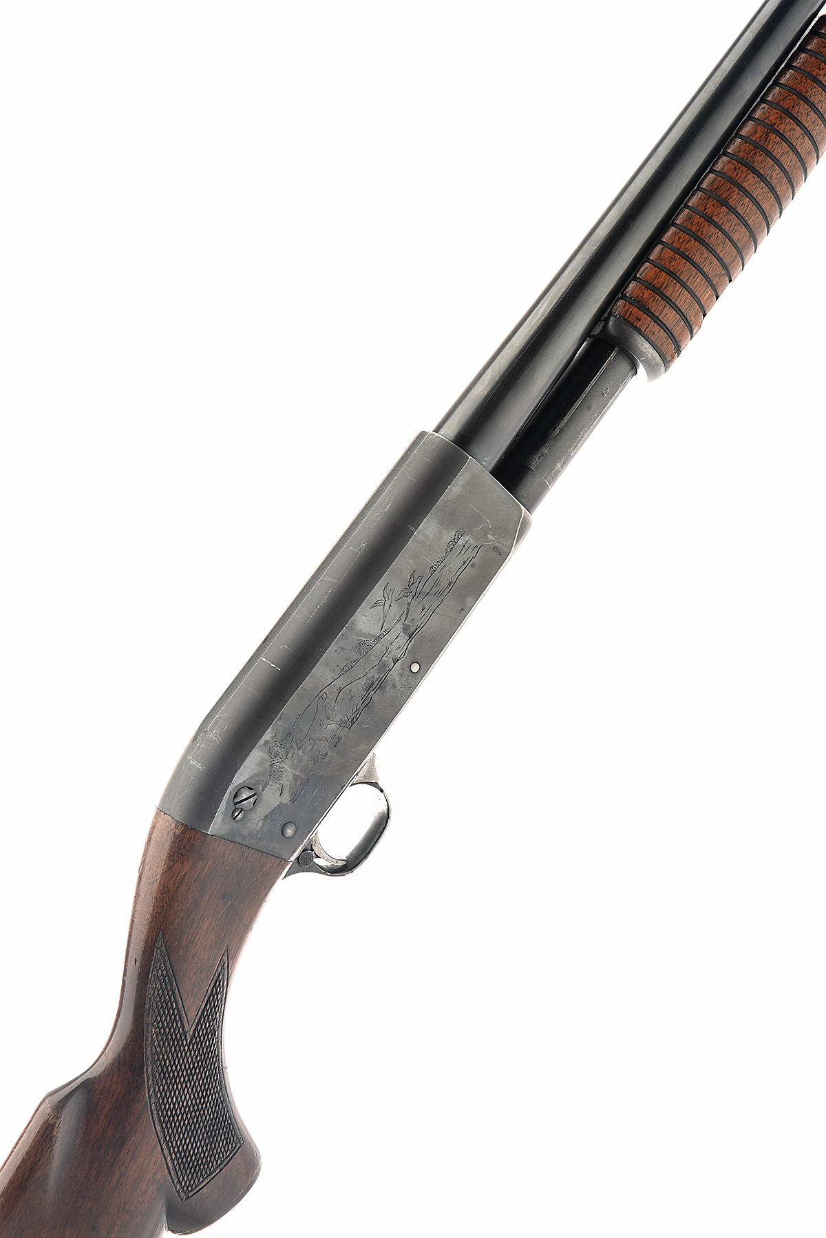 AN F.A.C. ITHACA GUN CO. 16-BORE 'MODEL 37' PUMP-ACTION SHOTGUN, serial no. 174463, circa 1939, 28in. ribless nitro reproved (in 2023) barrel, 2 3/4in. chamber, bored approx. 1/2 choke, manual safety, blacked action with naive game scenes, 14in. pistolgrip stock including buttplate