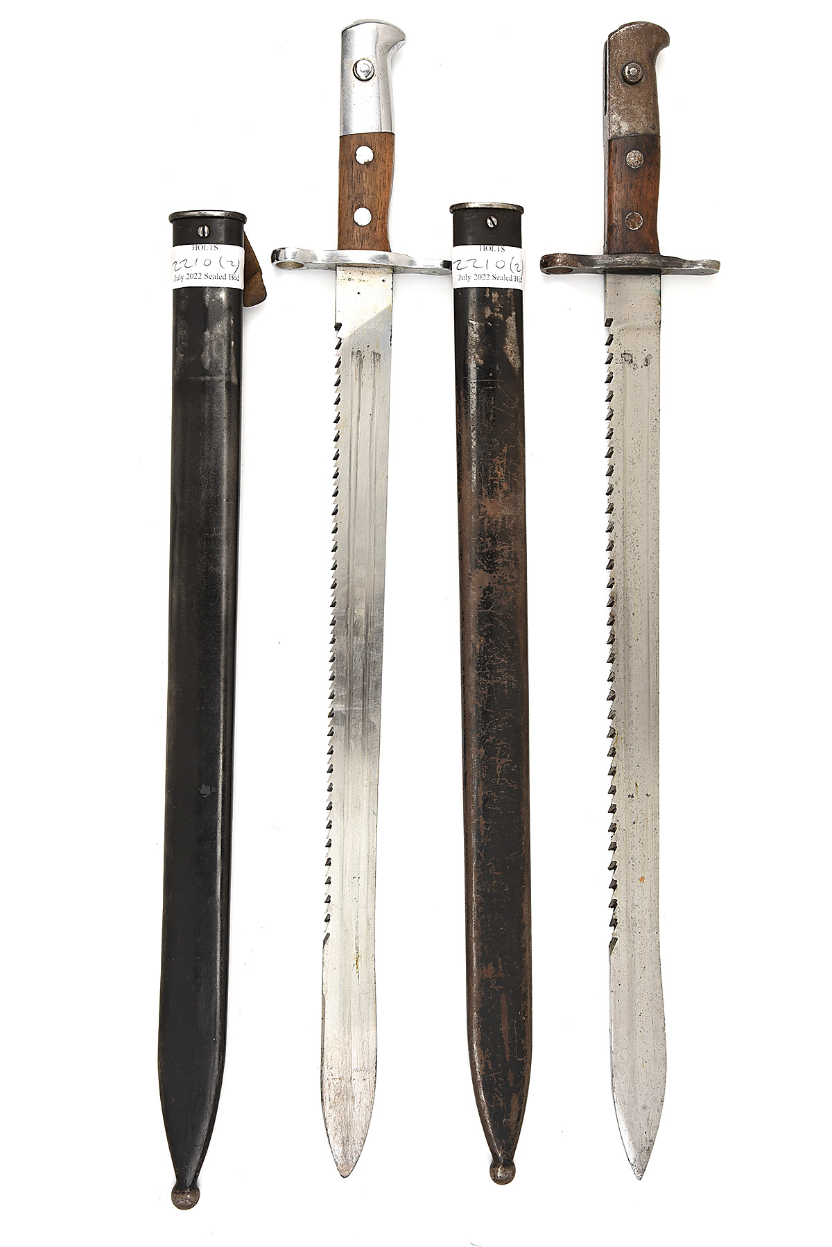 A PAIR OF SWISS MODEL 1914 SAW-BACK SWORD BAYONETS FOR THE SCHMIDT-RUBIN M1911 CARBINE, circa 1920s, with 19 in. single-edged steel blade, saw-backed and fullered on one side, riveted wooden grips, black steel scabbards with frog straps, 1) ricasso marked 'WAFFENFABRIK / NEUHAUSEN', steel hilt, cross-guard numbered '149083', worn with some surface rust; 2) ricasso marked 'ELSENER / SCHWYZ', nickelled steel hilt, service wear, each 25 in. overall