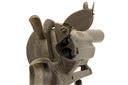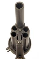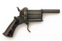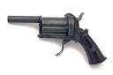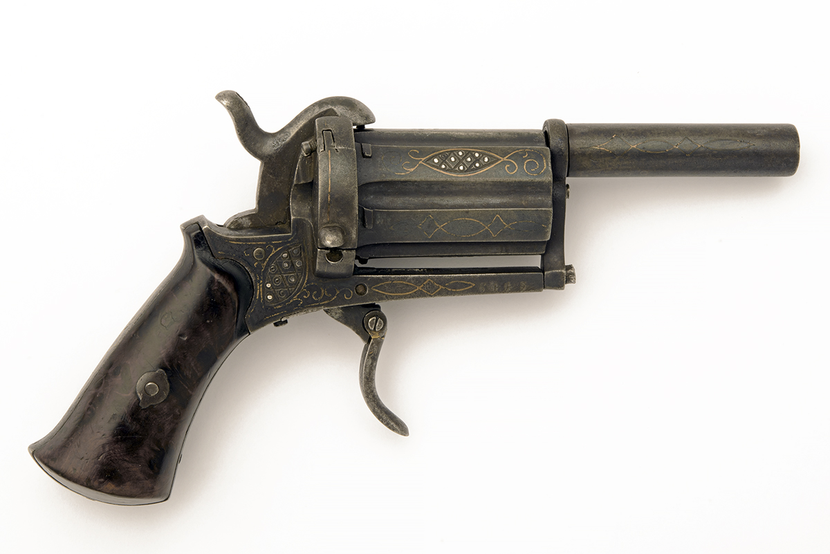 probably Belgian circa 1865, with round 2 3/4in. over-bored smoothbore detachable barrel, traces of yellow metal inlaid arabesques, the fully fluted extra-long six-shot cylinder or barrel group with short chambers and rifled for the remainder, each chamber inlaid with yellow metal arabesques, the alternate chambers further engraved with an additional geometric panel, open frame with full integral pin-guard and further yellow metal inlays and engraving, spurred hammer, folding double-action trigger and flared smooth burr-walnut grips with provision at heel for lanyard ring (missing)