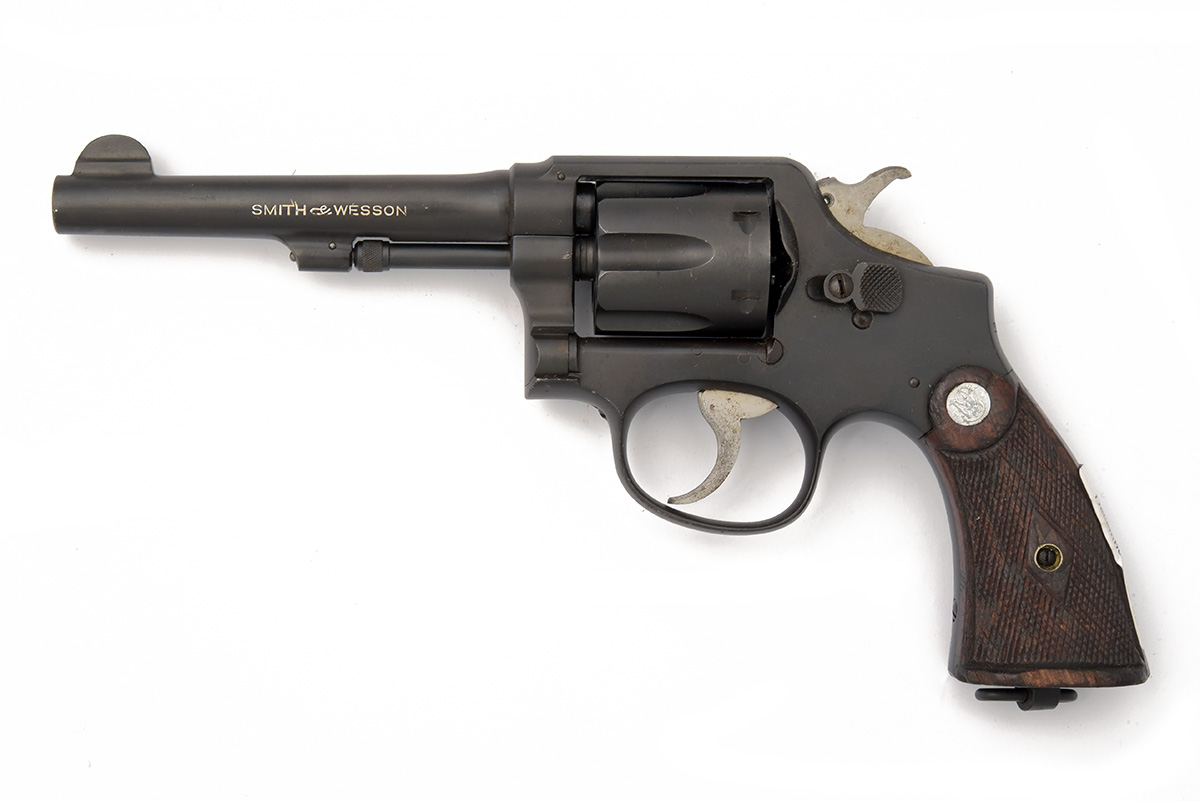 A .38 (S&W) VICTORY MODEL REVOLVER BY SMITH & WESSON, serial no. 784036, with 5in. barrel, swing-out fluted cylinder, chequered walnut grip and solid frame, refinished