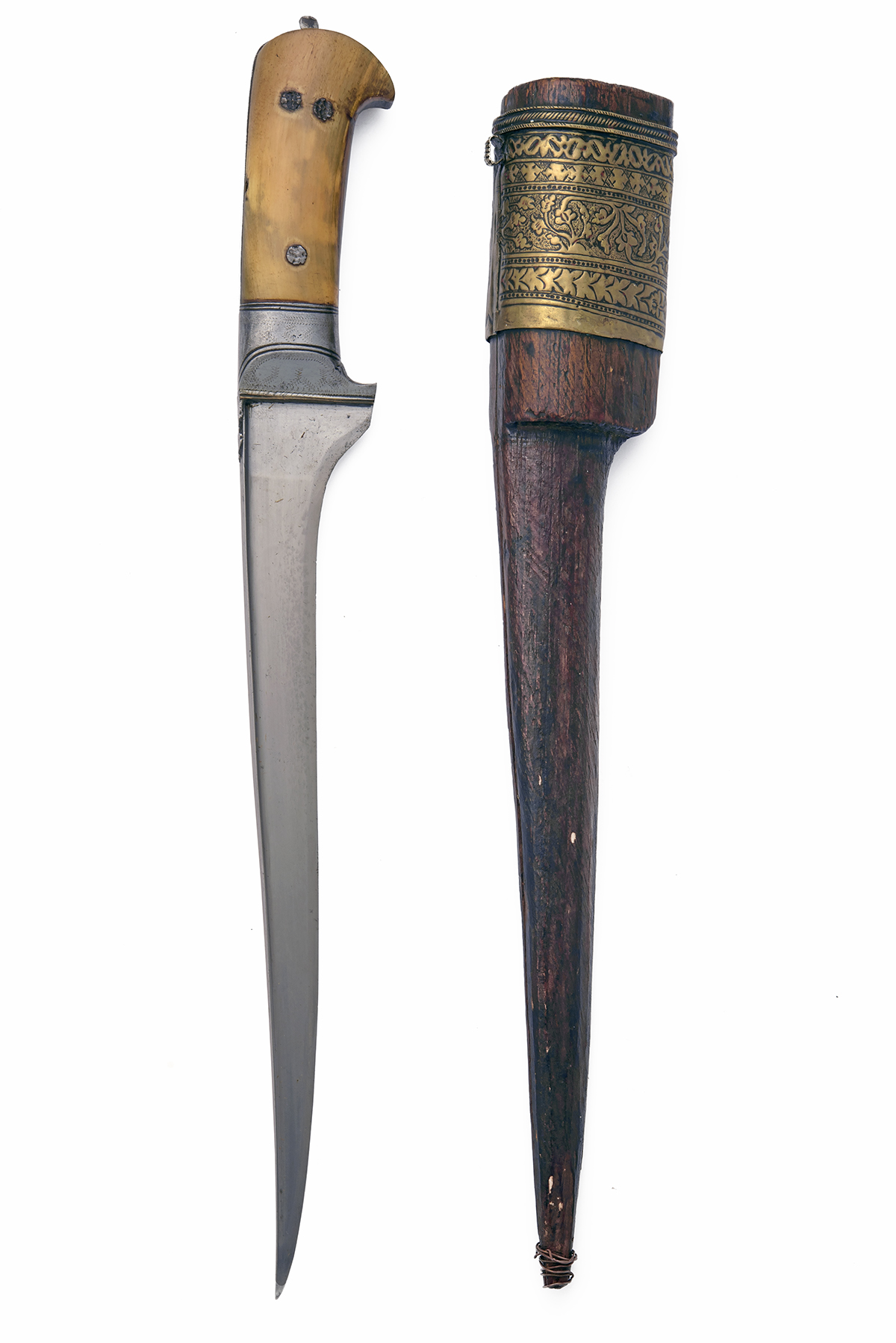 A FINE INDIAN PESH-KABZ DAGGER, late 19th Century, fashioned from a single piece of steel with riveted horn grips, 11 in. single-edged steel blade, hilt with hand engraving, together with its stained two-piece palm-wood scabbard, with decorated brass throat band, knife good and clean, scabbard halves separating,15 1/2 in. overall