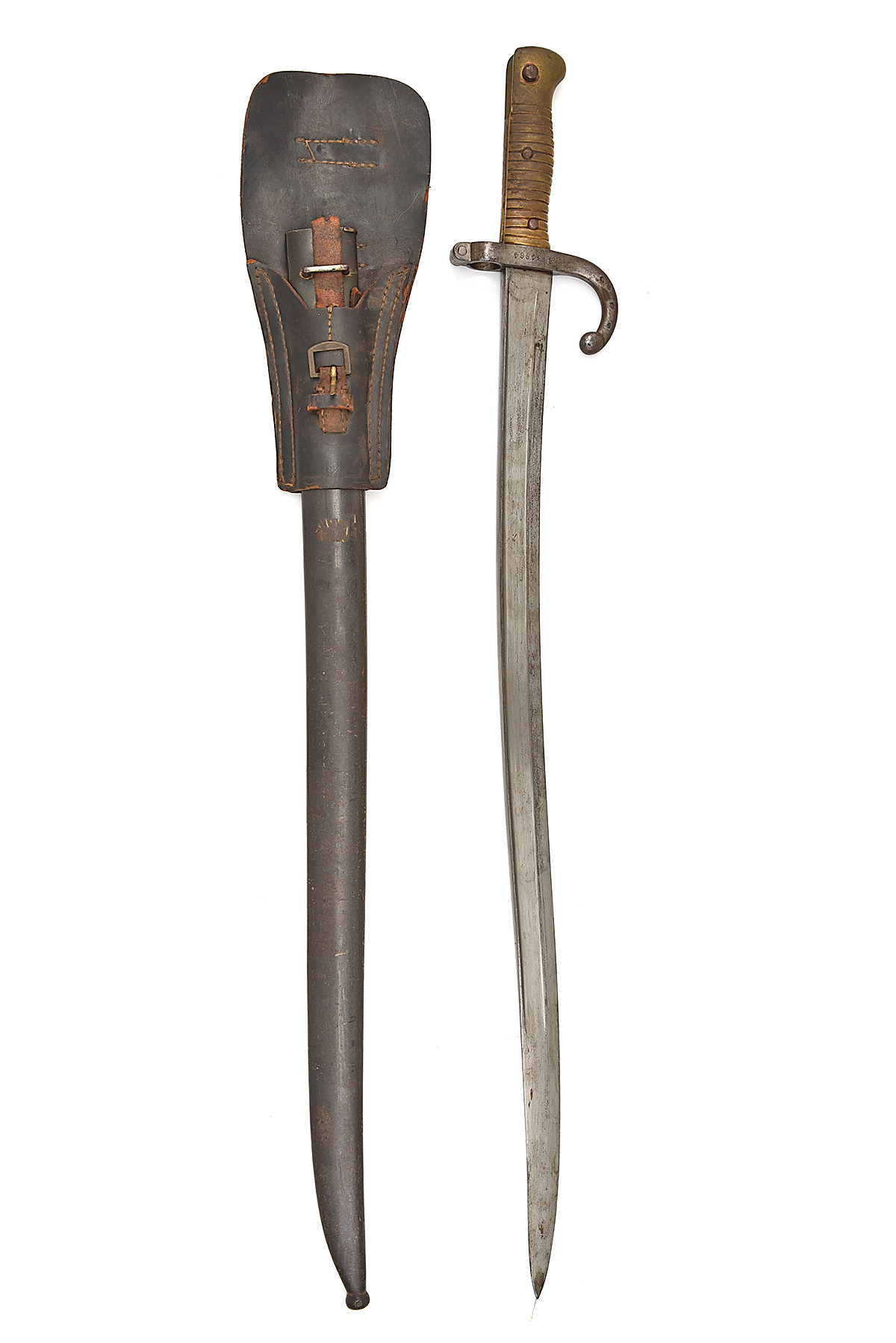 A FRENCH MODEL 1866 YATAGHAN SWORD BAYONET FOR THE M1866 CHASSEPOT RIFLE, dated 1871, with 23 in, single-edged steel blade, fullered on each side and St Etienne arsenal engraving on back, steel cross-guard with number 'R 34644', quillion stamped with inspection marks, brass hilt, together with its black steel scabbard numbered 'RS 36111' and black-fronted frog, blade back engraving faint, cross-guard rusted, end of frog strap missing, 28 in. overall