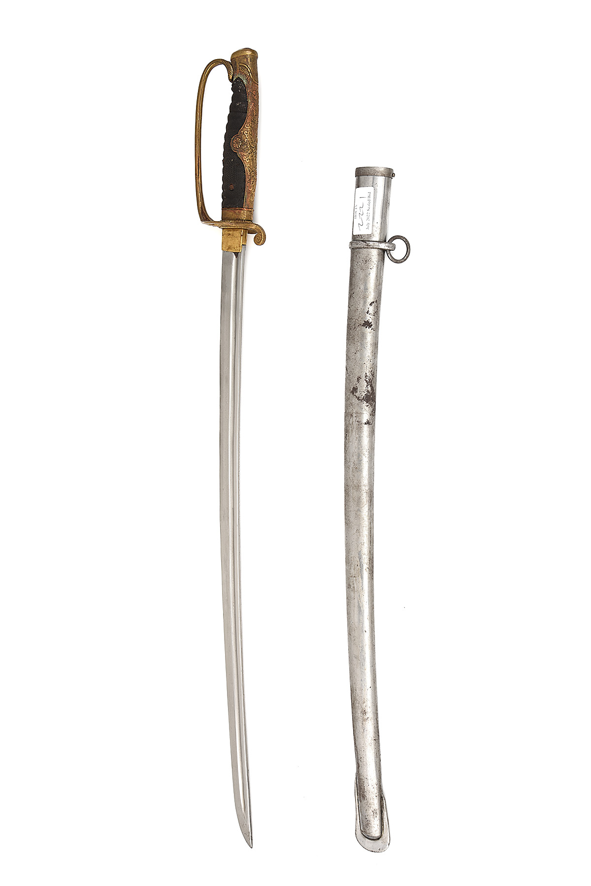 A 1920-1940 JAPANESE "KYU-GUNTO" ARMY OFFICER'S SWORD, circa late 1930s, with 24 1/2 in. slightly curved single-edged nickelled steel blade with clipped point, fullered on each side, brass ricasso, guard and hilt back-strap decorated with chrysanthemums and foliage, press-stud scabbard release button, black leather grip, together with its nickelled steel scabbard with suspension loop, hilt with patches of tarnish, grip worn and missing wire binding, scabbard catch missing, scabbard rusted, 34 in. overall