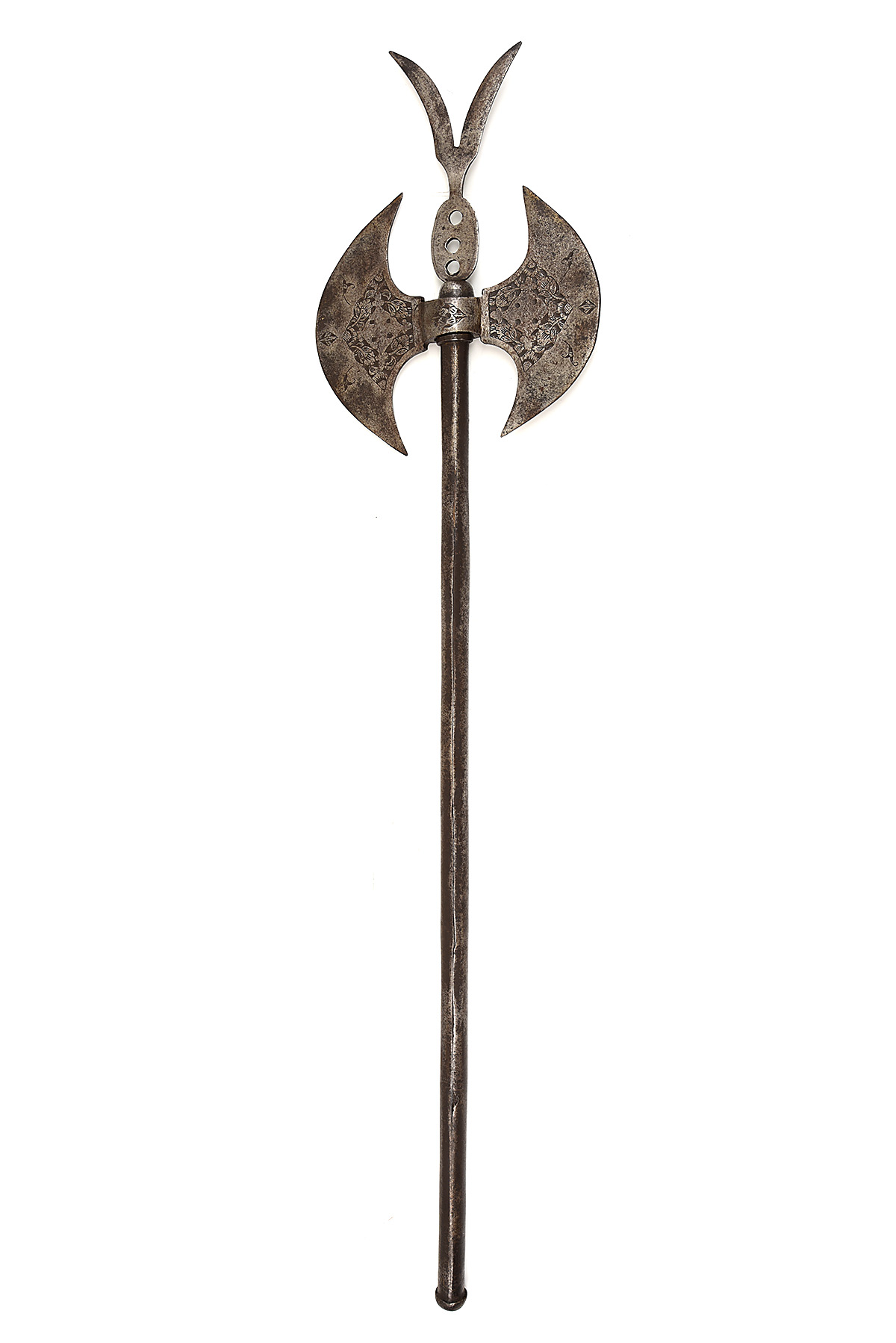 AN INDO-PERSIAN DOUBLE-HEADED PROCESSIONAL TABAR BATTLE-AXE, circa late 19th Century, all steel construction with 6 1/2 in. double-bladed head decorated with etched both sides with lotus flowers, split two-pointed finial mounted on a rolled steel shaft, head loose on shaft, 27 in. overall length