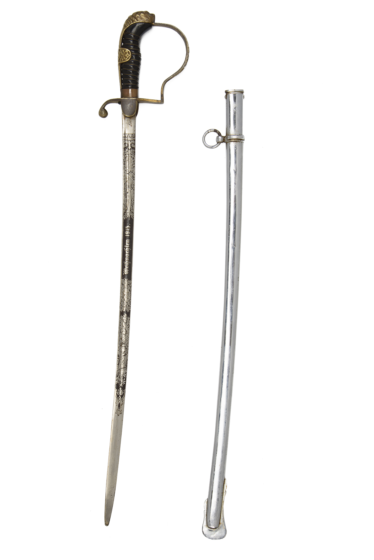 dated for 1915, with slightly curved 19 1/2in. blade, blind fuller to both sides and etched with foliage and trophies on a blued ground to both sides, the right side featuring the name 'HANS SCHUTZE-ADEN', the left with 'WEINACHTEN 1915' (Christmas 1915), moulded brass 'P' shaped knucklebow (strong traces of gilt), straight cross-guard with broad langets, one moulded with crossed cannon, and single turned down quillion with bulbous terminal, wire-bound ribbed horn grip-piece, moulded brass backstrap with reinforcing ears and lionshead pommel, complete with its plated iron scabbard