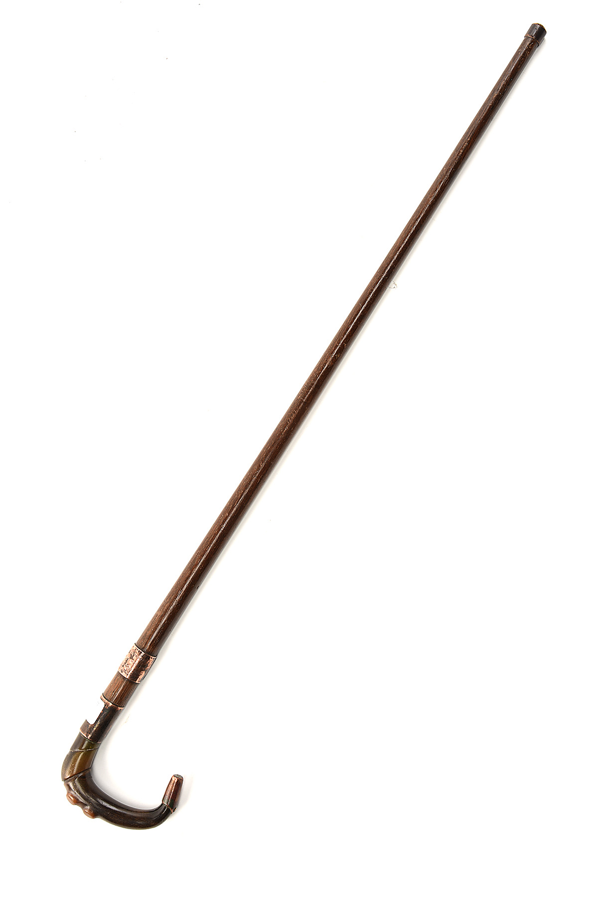 A VINTAGE HORN HANDLED WALKING STICK WITH MOUNTS FORMED FROM COPPER FROM H.M.S BRITANNIA, 30 1/4in. long, the moulded horn handle with a copper tip, copper ferrule to the shaft and central band engraved 'MADE FROM COPPER & TIMBER TAKEN FROM 'H.M.S. BRITANNIA', DARTMOUTH 1869-1905'