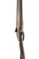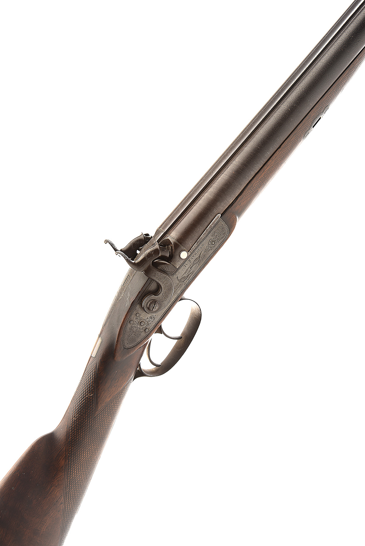 A 16 BORE PERCUSSION DOUBLE-BARRELLED SPORTING-GUN SIGNED WATMOUGH, no visible serial number, circa 1860, with 25in. twist barrels the top rib signed "R. WATMOUGH, 13 BLACKFRIARS STREET, MANCHESTER", bolsters with platinum plugs, and fixed breech engraved with high quality foliate scroll-work, the border decorated bar-action locks signed "R. Watmough" with further acanthus foliate scroll engraving together with game bird scenes, hammers engraved to match, iron mounted figured walnut half-stock with chequered wrist and forend, (worn) vacant silver escutcheon inset into the wrist, the iron mounts all with high quality scroll engraving. The barrels to a grey / brown patina some light speckling, a little thin at muzzles hammer noses damaged, replacement rod. Robert Watmough was established at 13 Blackfriars St, circa 1854-69.