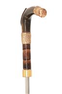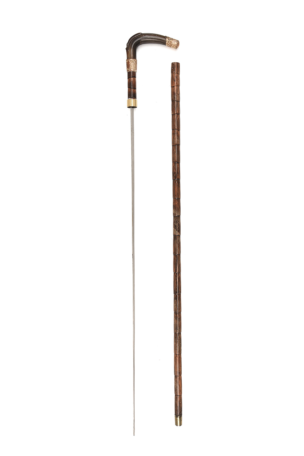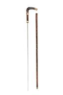 A CROOKED HORN HANDLE DRESS CANE SWORDSTICK, circa early 20th Century, with dark horn crooked handle with embossed brass mounts,collar with copper escutcheon engraved with italic initials, imitation cane shaft, brass ferrule with steel heel, 29 in. triangular steel blade fullered to the back, shaft split for approx. 10 inches both sides down from the throat and some grazing to the finish, 37 in. overall