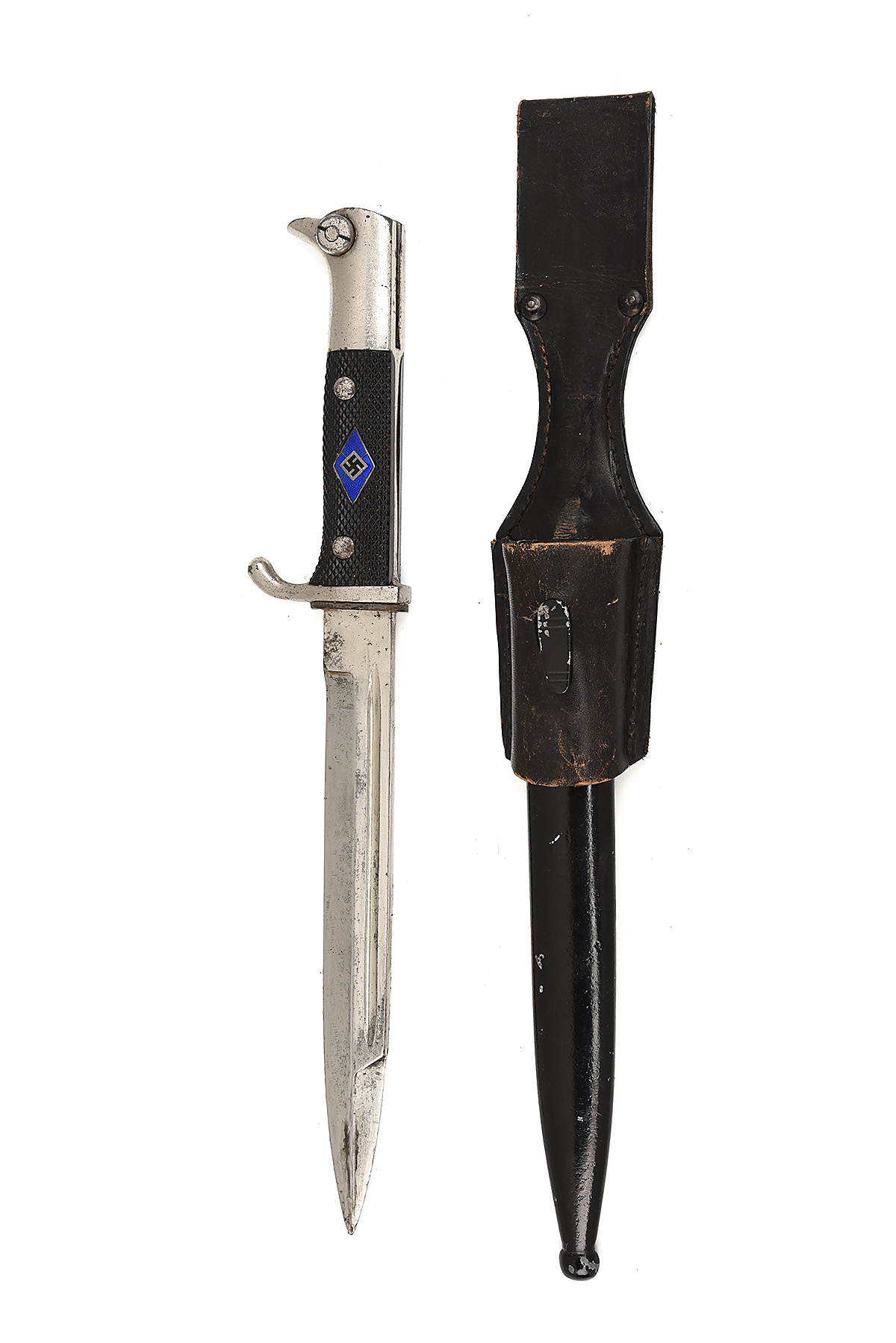 A GERMAN K98 DRESS BAYONET WITH SPURIOUS HITLER YOUTH BLUE MEMBERSHIP BADGE, circa 1930s, with 8 in. single-edged steel blade fullered on each side, ricasso marked 'E, PACK / & SOHNE / SOLINGEN', chromed pommel, black plastic grips with one side inset post-war with a blue Hitler Youth diamond badge, black steel scabbard unmarked black leather frog, 14 in. overall, fantasy piece