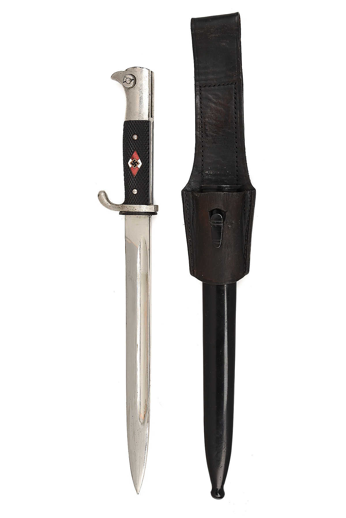 A GERMAN K98 DRESS BAYONET WITH SPURIOUS HITLER YOUTH RED MEMBERSHIP BADGE, circa 1930s, with 8 in. single-edged steel blade fullered on each side, ricasso marked 'POLS / SOLINGEN', chromed pommel, black plastic grips with one side inset post-war with a red Hitler Youth diamond badge, black steel scabbard, black leather 'F, FRANEK' Czech frog, 14 in. overall, wear to top of pommel, fantasy piece