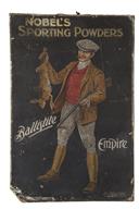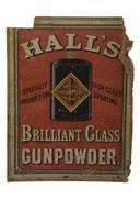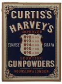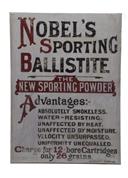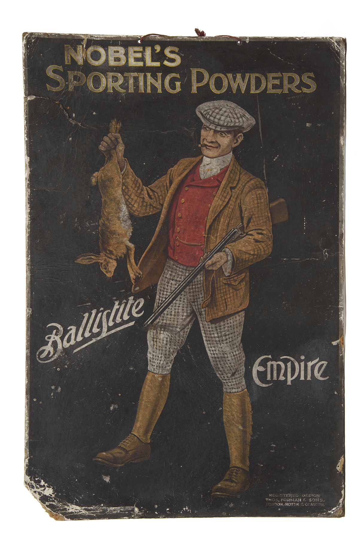 including a 19 1/4in. x 12 3/4in. example for 'NOBEL'S SPORTING POWDERS' (distressed), a 9in. x 7 1/4in. thin card example for 'THE DARTFORD SPORTING GUNPOWDER' by 'PICOUS & WILKS' (pin-holes), an early plastic example for 'NOBEL'S SPORTING BALLISTITE' measuring 14in. x 10in. (some fading to print), a card 'HALL'S BRILLIANT GLASS GUNPOWDER' sign measuring 12 3/4in. x 10in. (losses to edges, illustration scratched) and a 'CURTISS AND HARVEY'S IMPROVED SPORTING GUNPOWDERS' sign measuring 15 1/4in. x 11 1/2in.