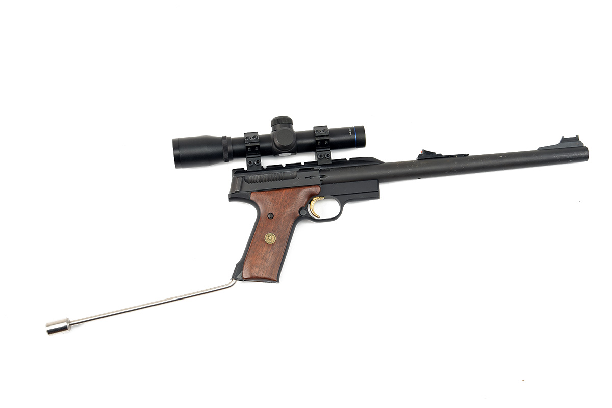 A CASED .22 (L/R) LONG-BARRELLED SEMI-AUTOMATIC PISTOL BY BROWNING, MODEL BUCKMARK, serial no. 213MR02221, with blacked12 1/4in. barrel, blacked slide, alloy frame with smooth walnut grips, permanent extension bar to rear for UK regulations, fitted with an AGS 2x20 pistol telescopic sight. in a foam-lined case with spare magazine