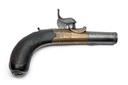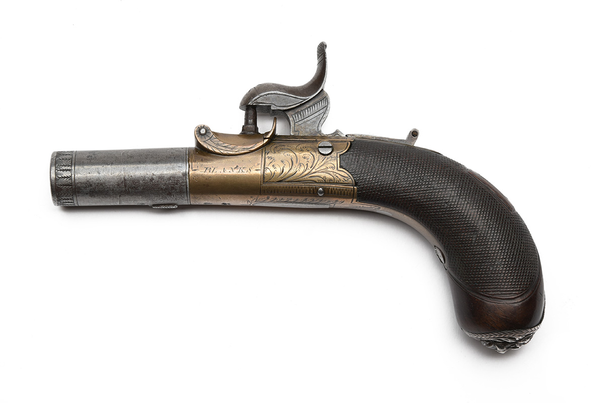 A BETTER .470 CONVERTED BOXLOCK PERCUSSION MUFF PISTOL SIGNED BLANKS, no visible serial number, circa 1800 flintlock converted to percussion circa 1830s, with 1 3/4 in. turn-off steel barrel, brass lock engraved with scroll-work both sides, with 'BLANKS' to one side and 'ROCHFORD' over, border engraved steel hammer, Birmingham proof marks, sliding safety, drop-down trigger, chequered walnut grip with square white metal escutcheon engraved with a belt containing a 'N', white metal lion-head butt-cap, actions correctly with strong spring on half and full cock, 6 1/2 in. overall