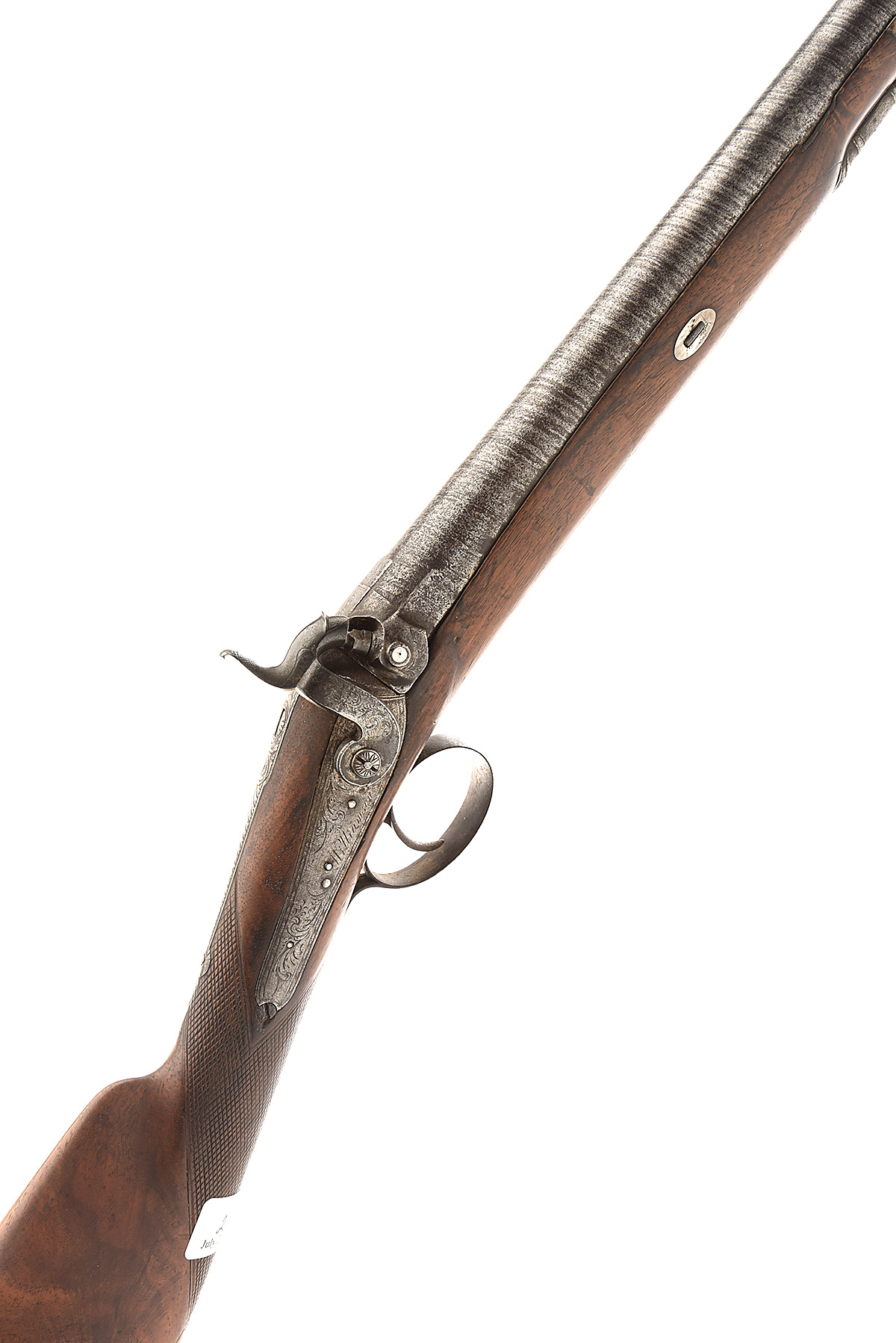 TWO PERCUSSION SINGLE-BARRELLED SPORTING GUNS, ONE BY WILLIAMSON THE OTHER UNSIGNED, no visible serial numbers, circa 1850. the first a 12 bore by Williamson with 30in. twist barrel having two platinum lines at breech, fixed breech with engraved foliate decoration, back-action lock, walnut half-stock with chequered wrist and fitted with engraved iron furniture, the butt with contemporary extension,. The second a 10 bore and unsigned, with 30in. barrel and fitted with a bar action lock, walnut half stocked with iron mounts, with repair above the back of the lock area., both complete with rods. Both worn overall.