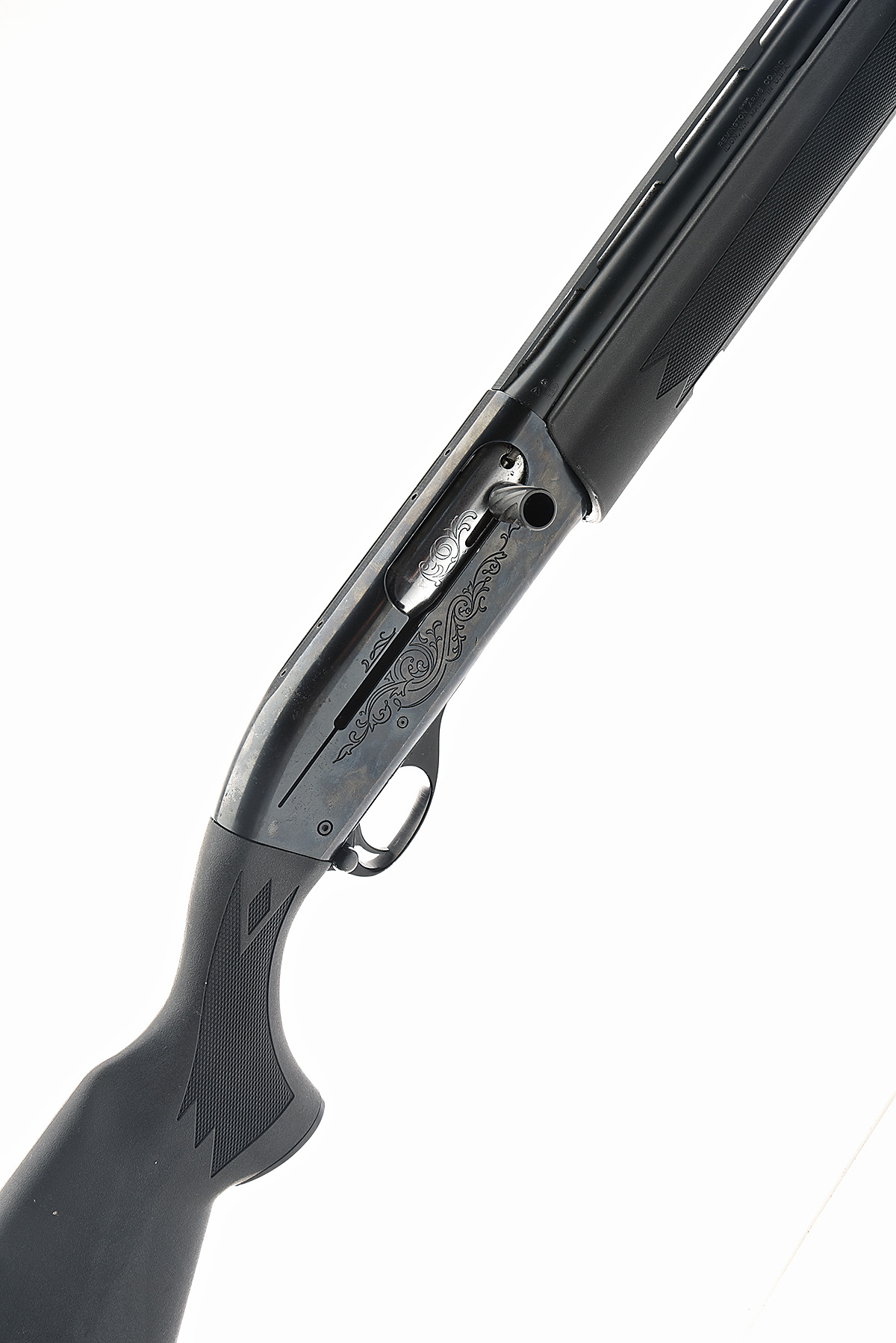AN F.A.C. REMINGTON 12-BORE 'MODEL 1100' SEMI-AUTO SHOTGUN, serial no. M029279V, circa 1975, extended tubular magazine, 25in. nitro reproved (in 2023) barrel including cutts compensator, with 7mm ventilated matt rib, 2 3/4in. chamber, multichoke (no spares), manual push-button safety, blacked action with partial acanthus scroll engraving, 13 3/4in. synthetic pistolgrip stock including rubber recoil pad, with monte carlo comb, the whole in matt black finish