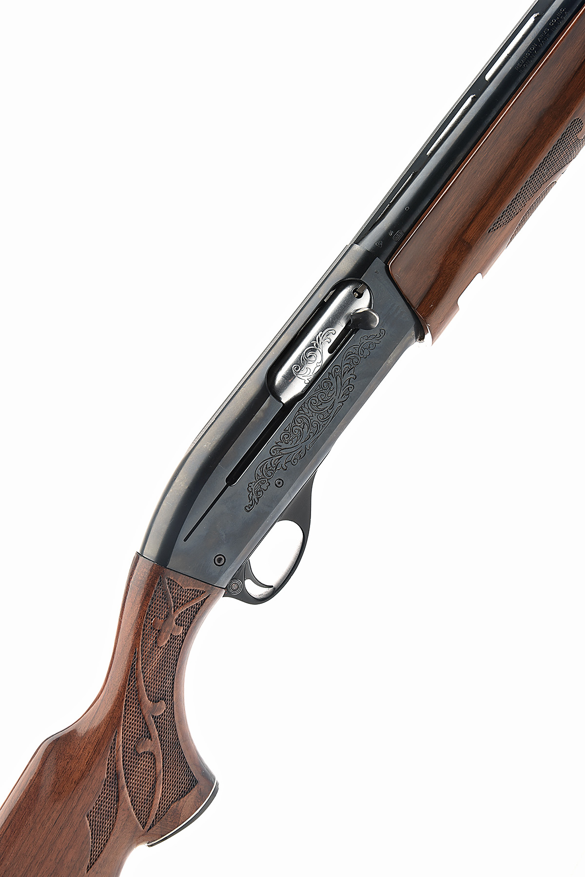 AN F.A.C. REMINGTON 12-BORE 'MODEL 1100' SEMI-AUTO SHOTGUN, serial no. N434955V, circa 1980, 28in. nitro reproved (in 2023) barrel with 8mm ventilated barrel, 2 3/4in. chamber, bored approx. 3/4 choke, manual push-button safety, blacked action with partial acanthus scroll engraving, 14 1/8in. ornately chequered pistolgrip stock including buttplate