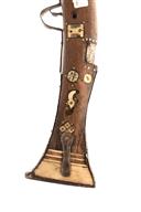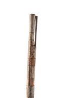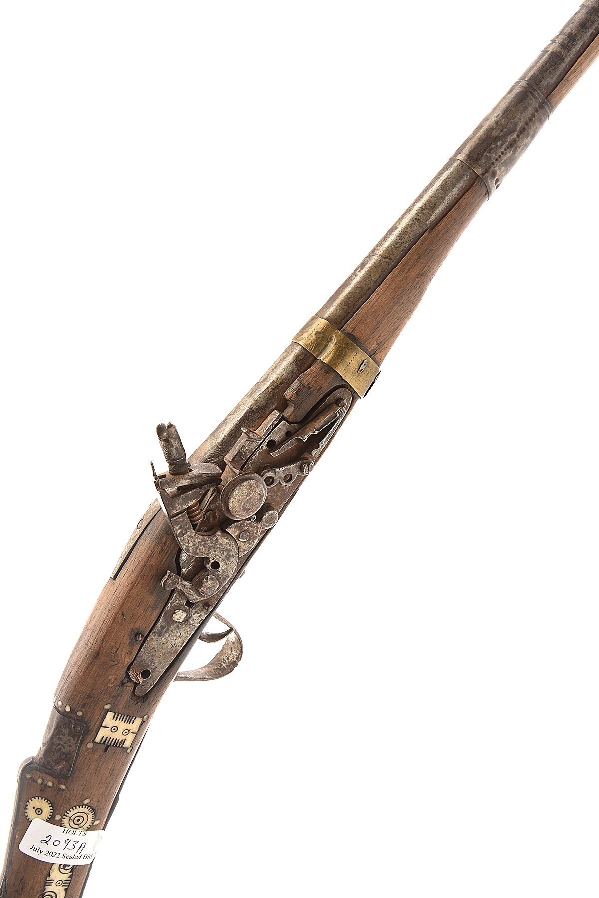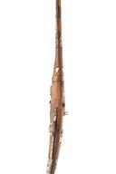 46in, two stage barrel with flared muzzle, bead front-sight and fixed vee rear-sight, miquelet style lock, full wooden stock with inlaid bone decoration and fish-tail butt, the barrel secured by fourteen wrapped and decorated metal bands.