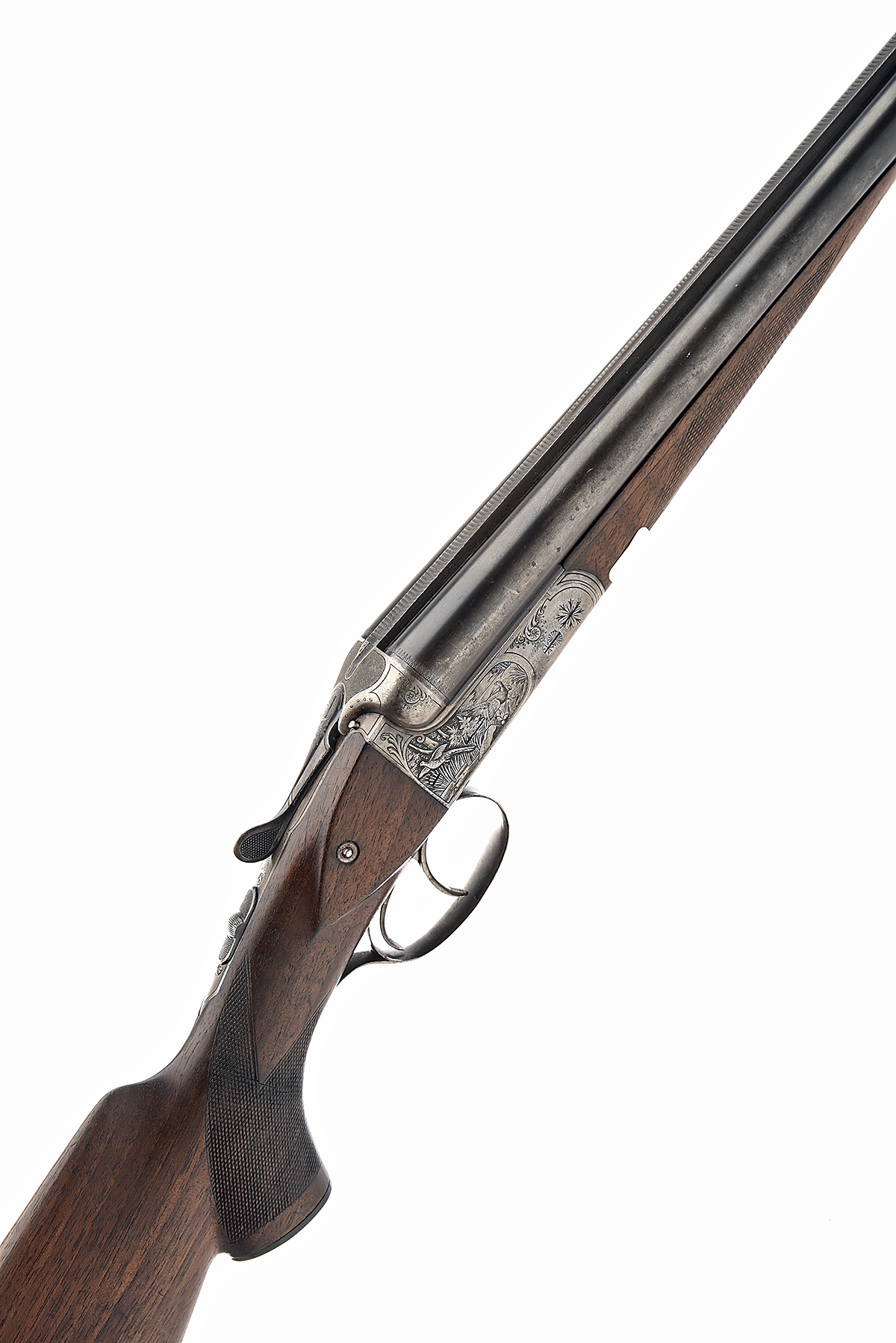 GERMAN 16-BORE BOXLOCK NON-EJECTOR, serial no. 34929, for 1930, 28 1/2in. nitro barrels, 2 1/2in. chambers, bored approx. 3/4 choke in both, treble-grip action, automatic safety, cocking indicator studs, border engraving surrounding game scene vignettes, 14 1/2in. pistolgrip stock with cheekpiece, sling swivels, including 1/2in. wooden extension