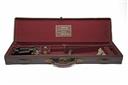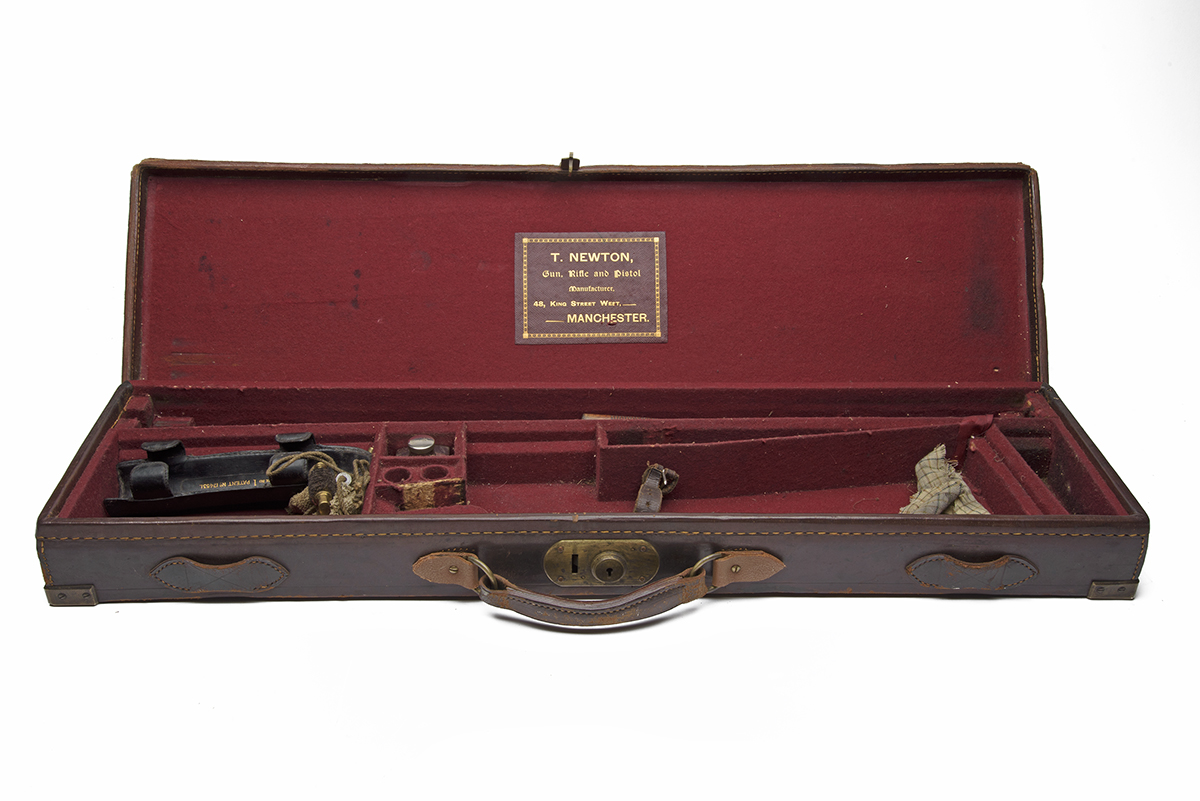 fitted for 30in. barrels, the interior lined with maroon baize, a red leather gold-tooled T. Newton trade label, brass lock (key missing), the lid exterior with 'J.H. H.P.'