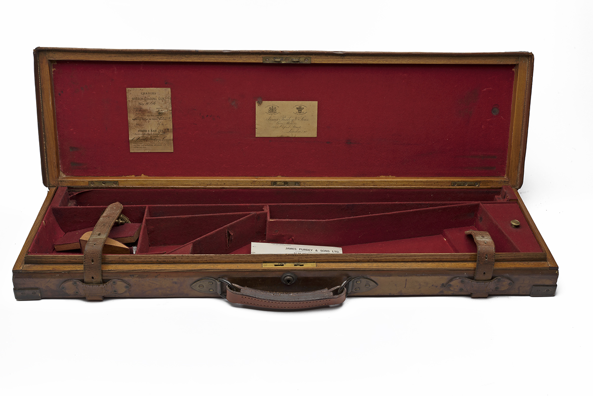 fitted for 30in. barrels, the interior lined with red baize, a James Purdey & Sons trade label, central brass push-button lock (key missing), the lid exterior embossed with 'J.E.F. Chambers The Hurst', and with a blank brass escutcheon
