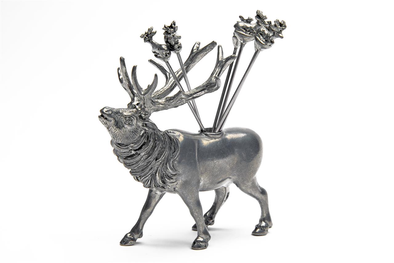 A SET OF SIX STAGS HEAD COCKTAIL STICKS WITH FULL STAG HOLDER