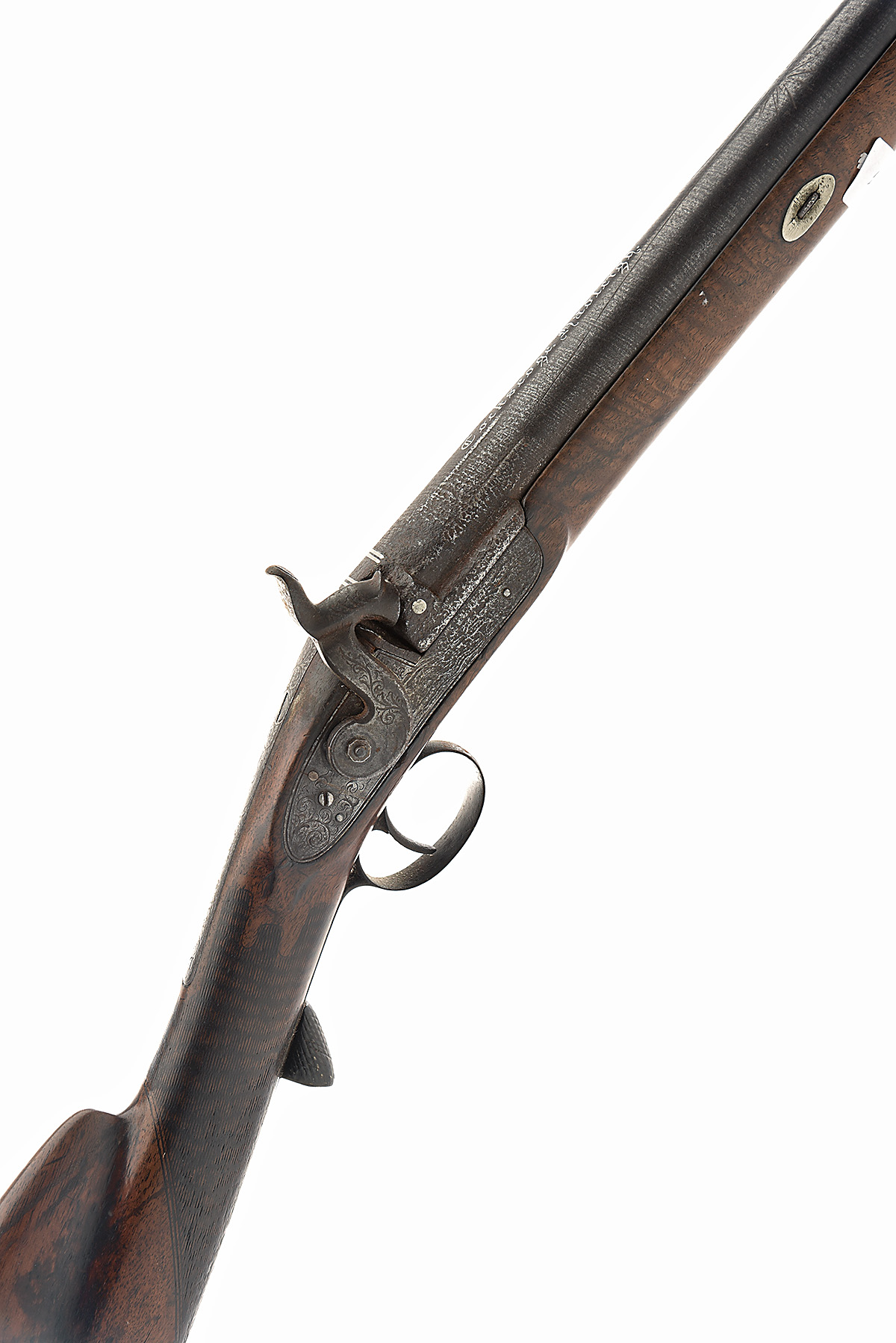 A 12 BORE SINGLE BARREL PERCUSSION SPORTING GUN BY COCKSEDGE OF HADLEIGH, CIRCA 1850, no visible serial number, with 33 1/2 in twist barrel, engraved with a starburst and the retailers name inlaid with silver 'COCKSEDGE HADLEIGH', at the breech, nipple bolster with platinum plug, the breech area heavily corroded, foliate engraved bar-action lock the front area below the bolster heavily pitted, nipple corroded and broken, iron mounted walnut half-stocked with chequered wrist, the maker was Henry Cocksedge of Hadleigh Suffolk, established 1838-1869.