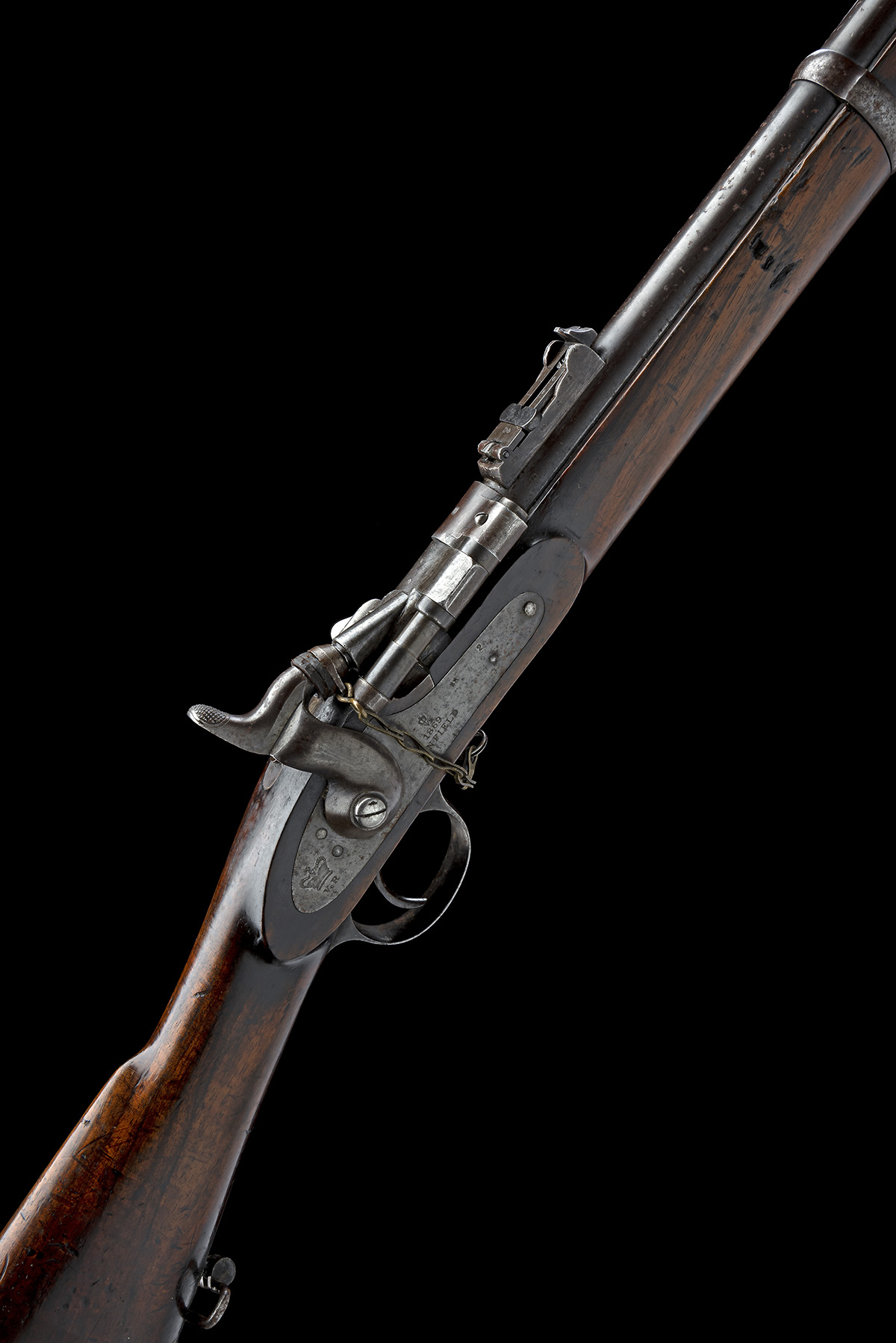 with 30 1/2in. steel barrel rifled with five grooves and fitted with a bayonet lug at muzzle, block and blade front-sight and usual ladder rear-sight, the breech profusely Ordnance marked, the lock stamped on the tail with the Queens cypher of the Crown over V.R. on the tail and '1869 / ENFIELD' to the centre, regulation iron mounted full walnut stock, the right butt stamped with the Enfield 1st class roundel and the left butt with the Dominion of Canada ownership mark of 'D.C.' in a diamond and 'M.G.A / 238' indicating issue to the Montreal Garrison Artillery, the rifle is complete with its sling swivels, rod, and snap-cap, and having some fading original finish
