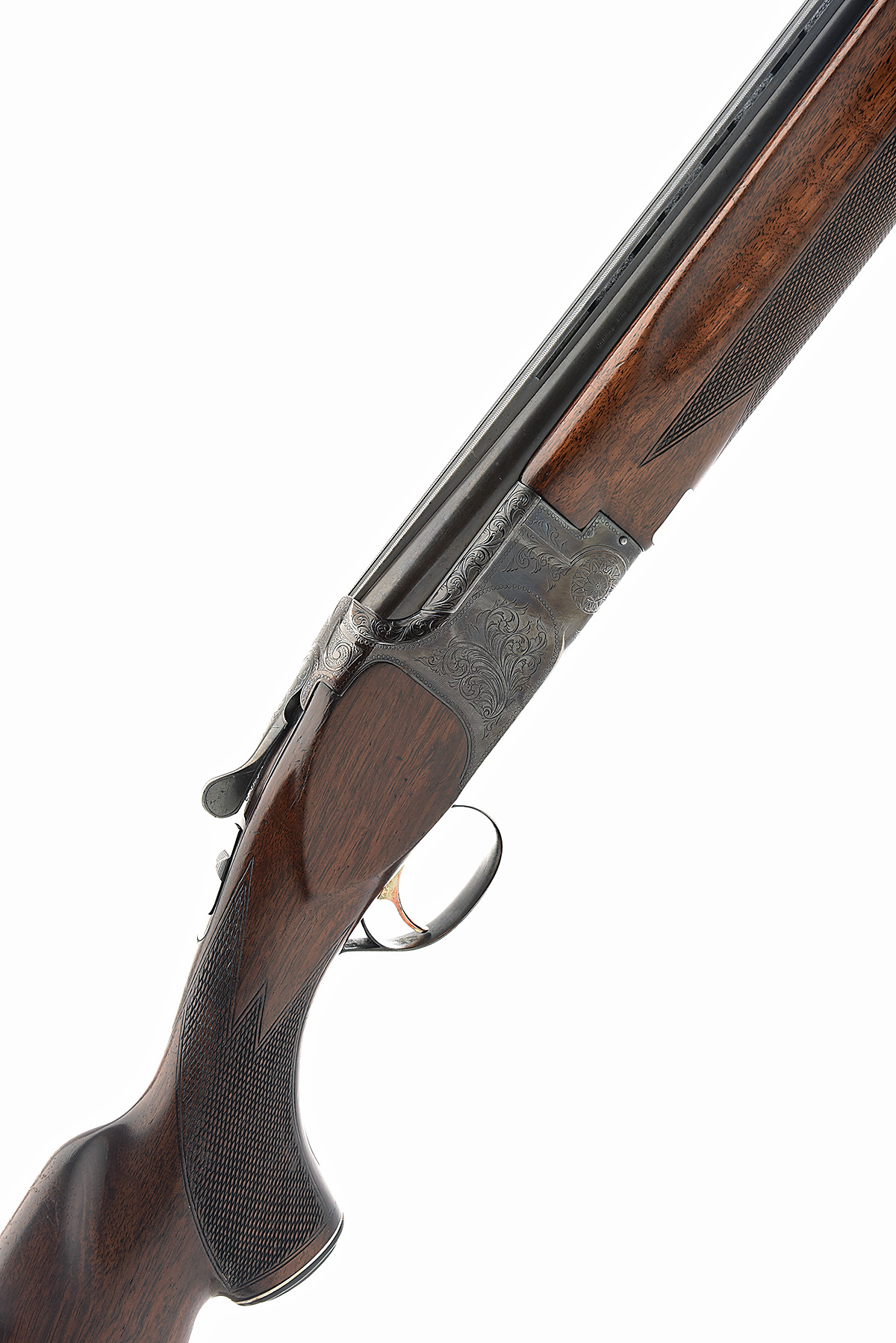 B.C. MIROKU 12-BORE SINGLE-TRIGGER OVER AND UNDER EJECTOR, serial no. 672103, circa 1973, 26in. nitro barrels with 13mm ventilated matt top-rib, 2 3/4in. chambers, bored approx. imp. cyl. in both, hold-open toplever, manual safety with integral barrel selector switch, gold-washed single trigger, beaded border and acanthus scroll engraving, 14in. pistolgrip stock including buttplate, weight 7lb. 5oz.