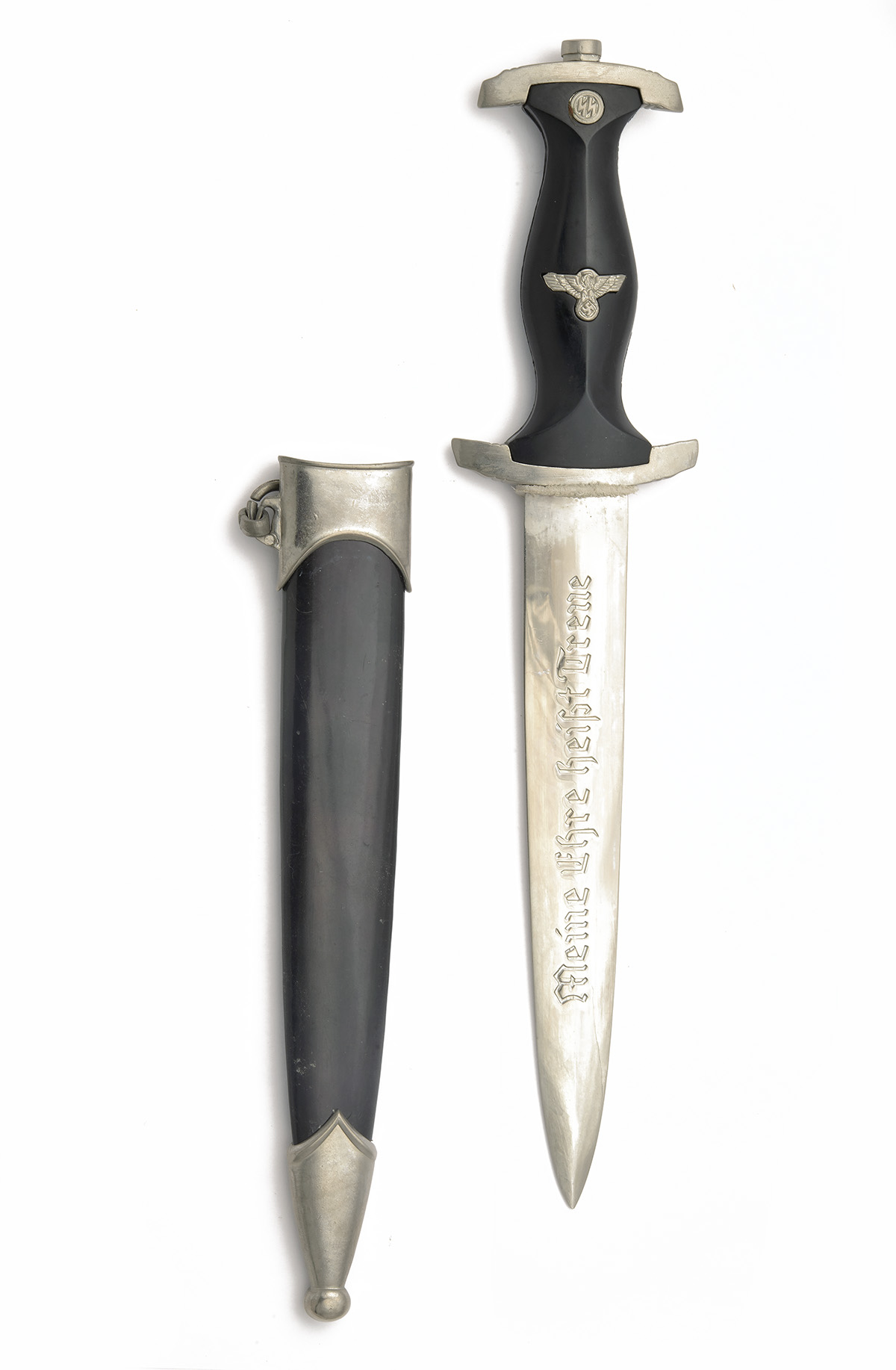 A REPRODUCTION GERMAN RSM SS DRESS DAGGER AND A DEER FOOT HUNTING KNIFE, 1) 8 1/2 in. double-edged nickelled steel blade with cast 'Meine Uhre Heist Treue' script, ricasso over marked with circled 'RZM' trademark and 'M7 / 14', plastic hilt with plastic inlaid eagle & swastika and SS runes together with its black steel scabbard with nickelled steel mounts, 14 1/2 in. overall; 2) single-edged unmarked 3 3/4 in. nickelled steel blade attached to a deer-foot hilt, together with its buff leather scabbard