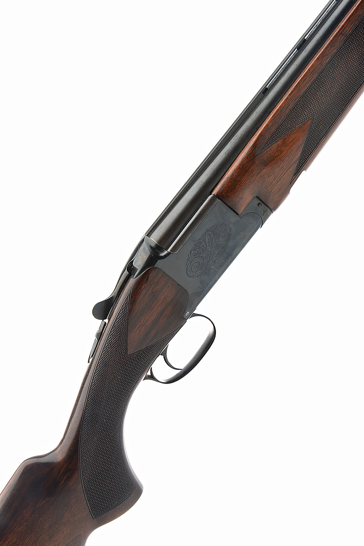 FABRIQUE NATIONALE 12-BORE SINGLE-TRIGGER OVER AND UNDER EJECTOR, serial no. 77J 25714, for 1977, 28in. nitro barrels with 7mm ventilated matt top-rib, 2 3/4in. chambers, bored approx. 1/4 and 3/4 choke, hold-open toplever, manual safety with integral barrel selector switch, partial scroll engraving, 15in. semi-pistolgrip stock including 1in. extension, weight 7lb. 6oz.