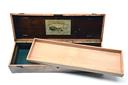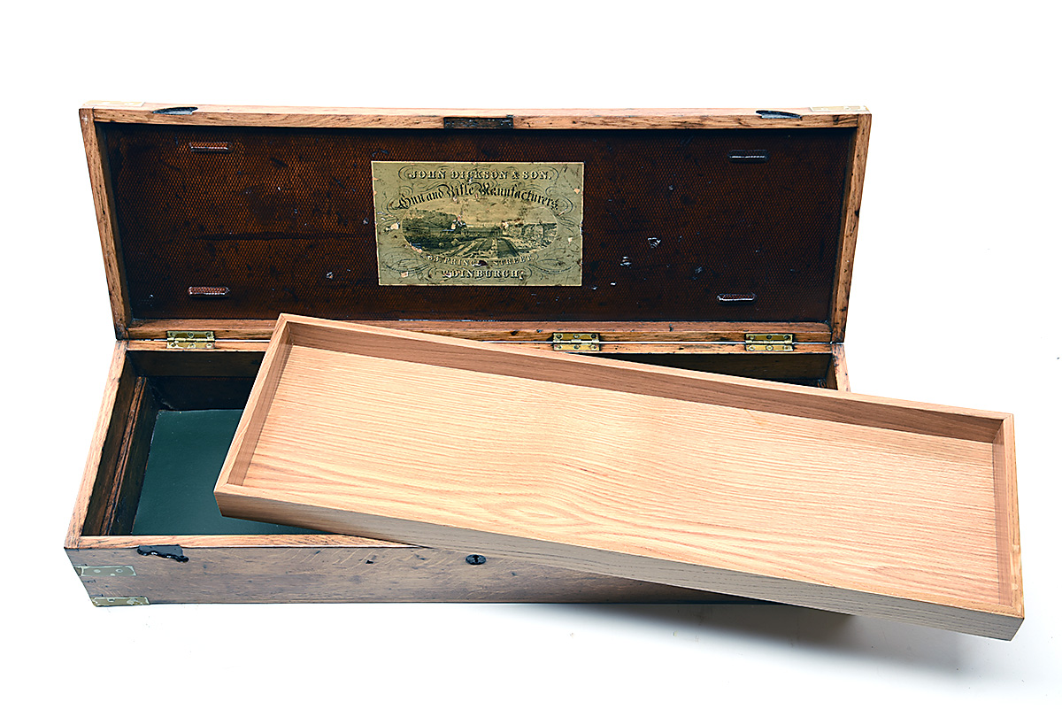 A JOHN DICKSON & SON BRASS-MOUNTED TWO-TIER OAK GUNCASE, with no internal sectioning, replacement try, the lid interior with a John Dixon & Son trade label, lock missing, brass clasps missing, the lid exterior with a central blank brass plaque