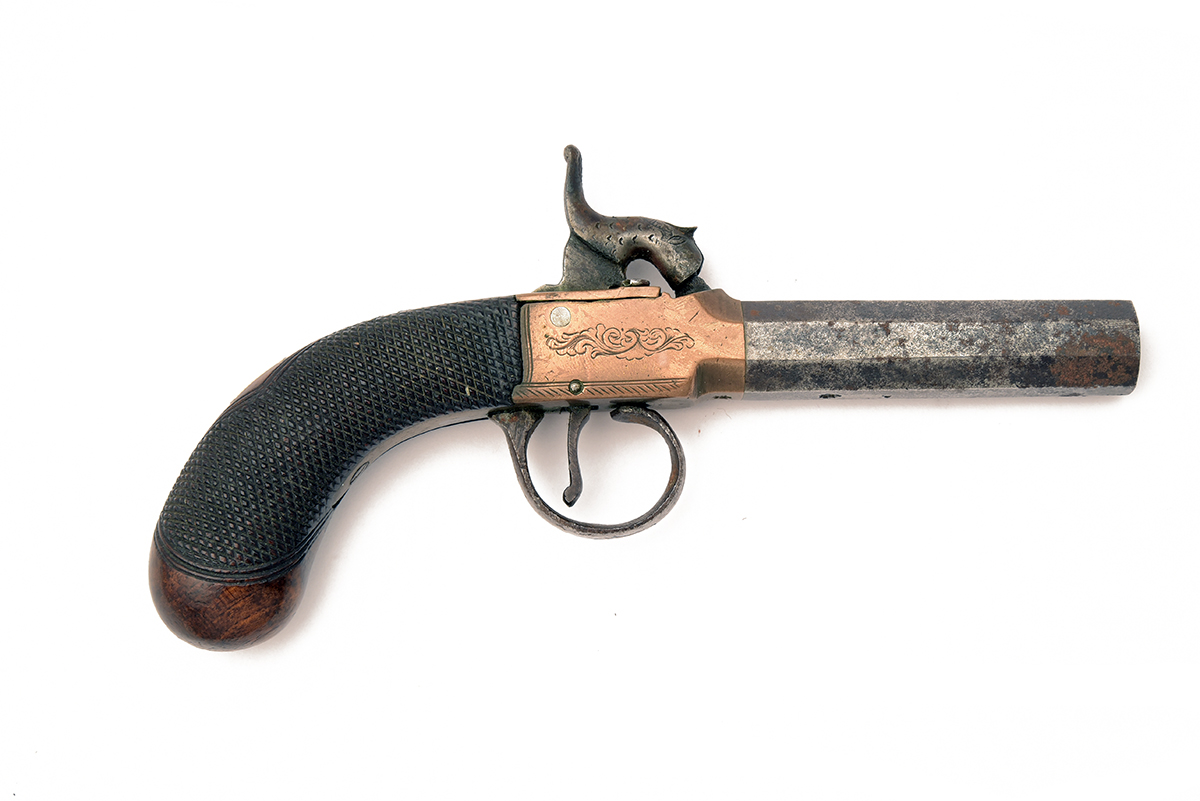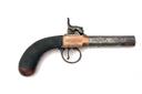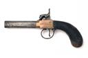 A .41 PERCUSSION TURN-OFF BOXLOCK PISTOL, UNSIGNED, no visible serial number, circa 1830s, with 3 in. octagonal steel barrel, brass lock with decorated scroll-work sides and tang, Birmingham proofs, decorated 'dolphin' hammer, bag-shaped chequered wooden grip with blank white metal escutcheon, trigger-guard with scroll-work, staining and rust patches to the barrel, some minor chipping to the grip, 7 1/2 in. overall