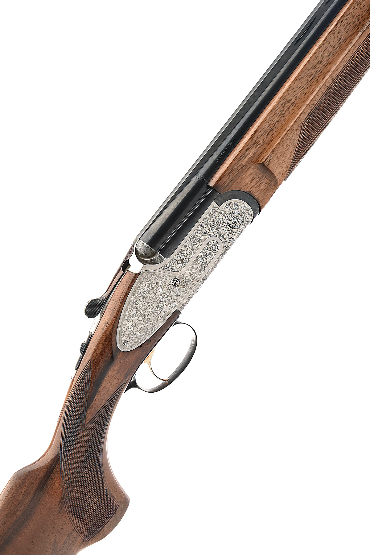 EMILIO RIZZINI 12-BORE SINGLE-TRIGGER SIDEPLATED OVER AND UNDER EJECTOR, serial no. 28442, dated 1984, 26in. nitro barrels with ventilated mid-rib and 12mm ventilated matt top-rib, 2 3/4in. chambers, open chokes, hold-open toplever, manual safety with integral barrel selector switch, gold-washed single trigger, floral scroll engraving, 13 1/2in. pistolgrip stock including buttplate, weight 7lb. 8oz.