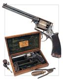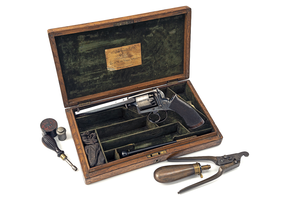 Provenance: The Model 1851 Adams is an important collector's revolver being the first practical British revolver and competitor of Colt. This example dates to around 1853 and is a rare variation with a cylinder that turns counter clockwise, the opposite direction to normal. Examples with this unusual feature are found in the 8000 and 10,000 serial ranges, why it was done is unknown