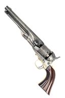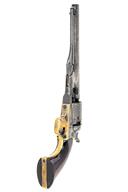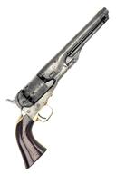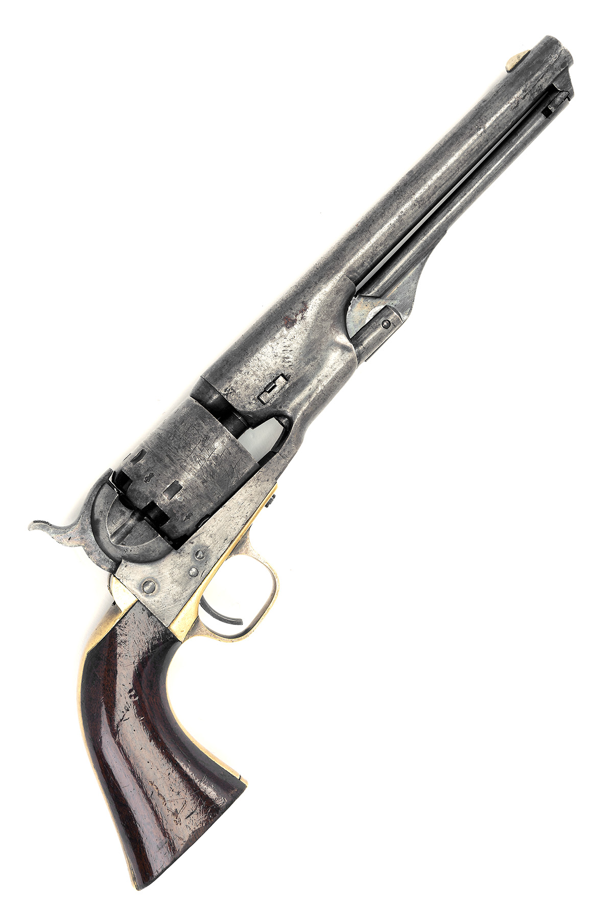 for 1864, with round 7 1/2in. barrel signed 'ADDRESS COL. SAML. COLT NEW-YORK U.S. AMERICA', period London proofs, shallow nickel blade fore-sight, plain six-shot cylinder with roll-engraved scene, open iron frame marked 'COLTS PATENT', calibre marking to left rear of trigger-plate, smooth flared walnut grip, slight traces of finish and colour remaining, all matching numbers (mainspring and hand at fault or absent, front trigger guard screw replaced and wedge-screw absent)