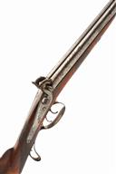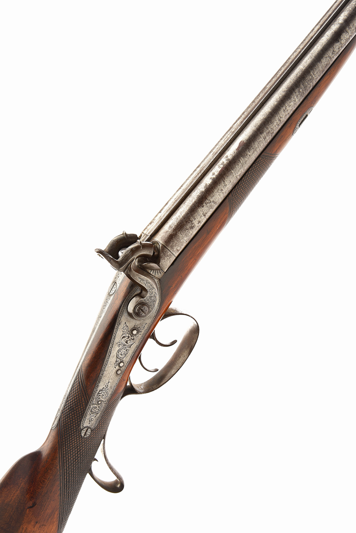 A 28 BORE DOUBLE BARREL PERCUSSION SPORTING GUN SIGNED KAYE, MANCHESTER CIRCA 1850,no visible serial number, with 31 1/2" skelp twist barrels engraved near the breech "KAYE MANCHESTER", and fitted with two rammer pipes, the fixed breech decorated with some acanthus scroll engraving, border decorated back-action locks with similar acanthus scroll engraving the hammers engraved engraved to match, the left hammer missing the spur, walnut half stock with chequered wrist and forend, the iron mounts including butt-plate, scroll trigger-guard and fore-pipe all engraved to match, complete with its original ebony loading rod, the barrels to a grey patina, the stock quite sharp. The maker was John Kaye of 68 Shude Hill Manchester in business circa 1844 to 1864.