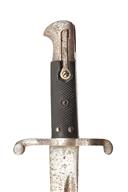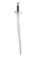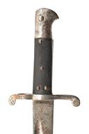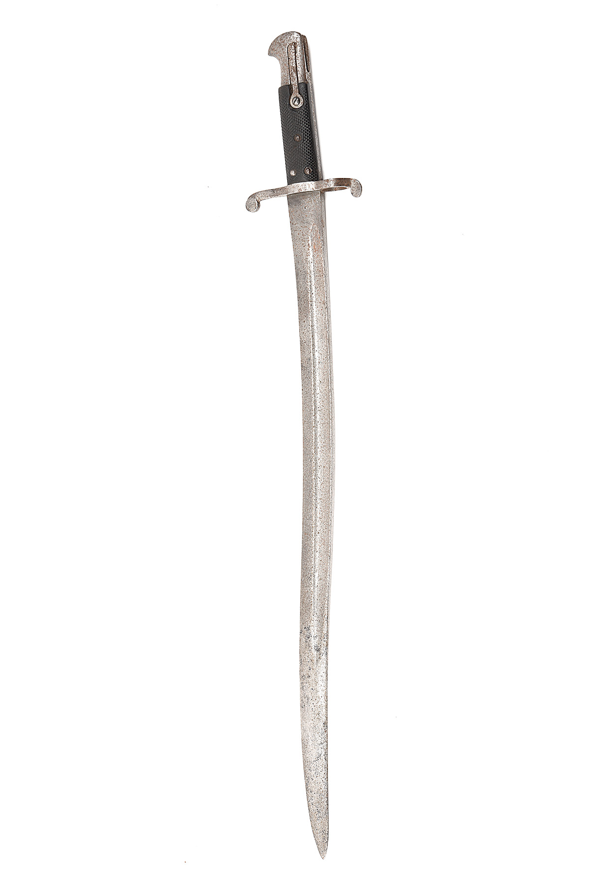A PATTERN 1860 YATAGHAN SWORD BAYONET FOR THE P1853 ENFIELD RIFLE, early 1860s, with 23 in. single-edged steel blade fullered on each side, ricasso with Broad Arrow, bend test 'X' and inspection marks, with Weyersburg Solingen crowned king mark and inspection marks over, steel hilt and cross-guard, pressed black leather grips, pommel numbered '354', surface rusting and replaced leaf-spring, no scabbard, 28 in. overall