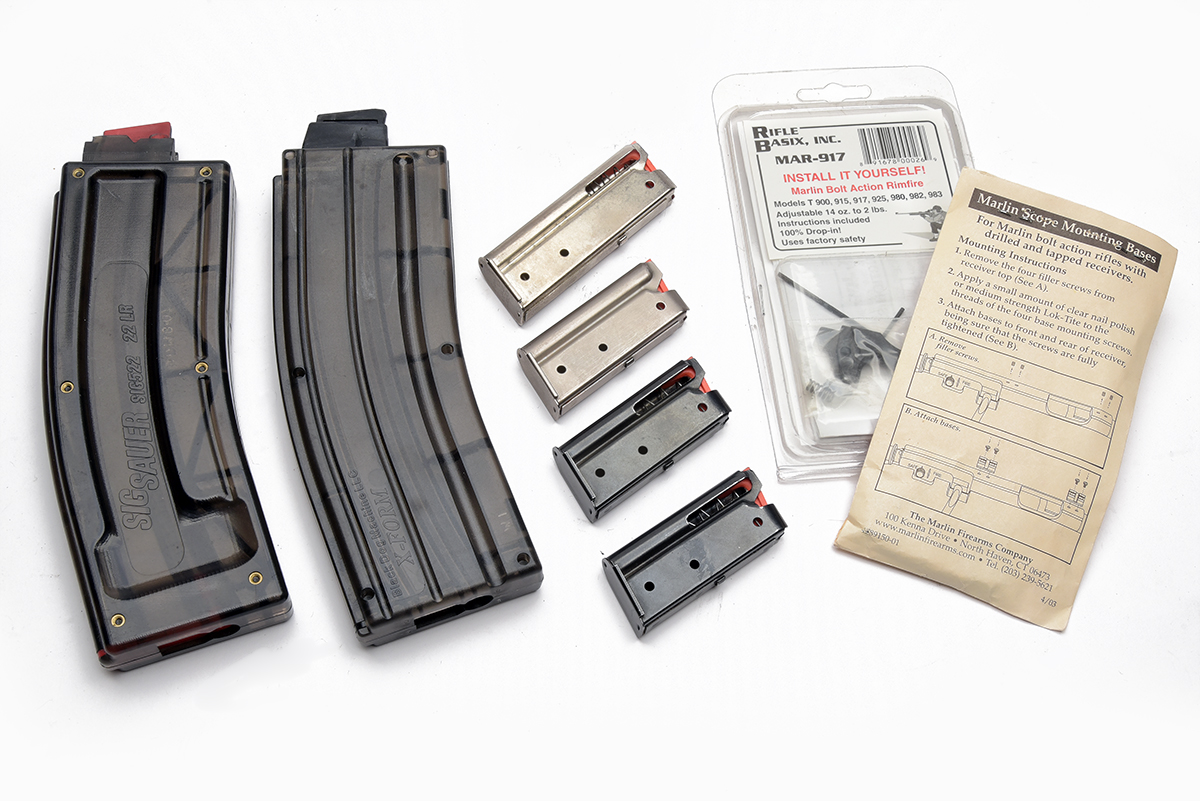 5 MAGAZINES FOR 22 LR RIFLES, comprising of, 2 Sig Sauer 522 high capacity magazines and 4 Marlin 719/795 magazines, trigger and scope mount bases.