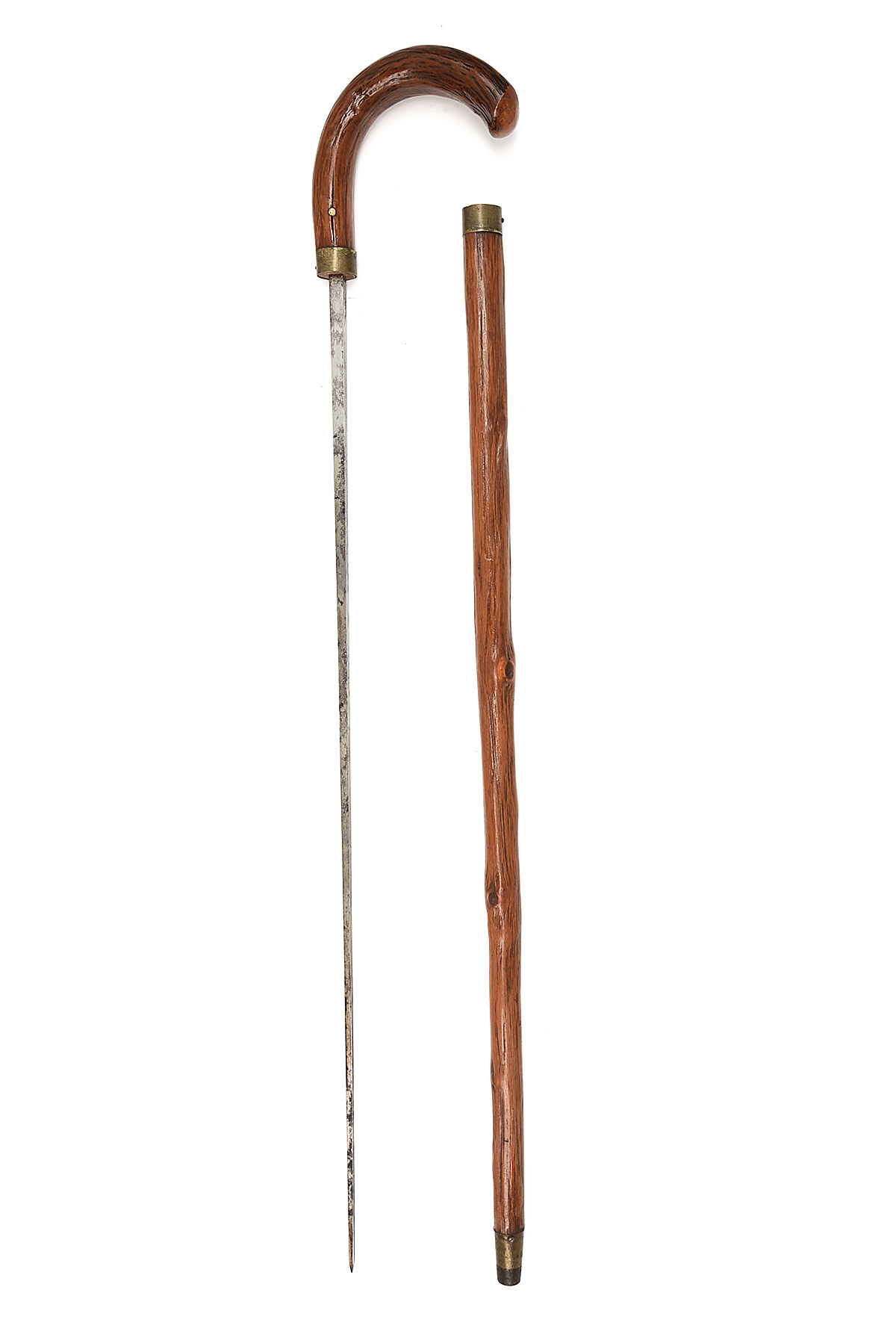 A BRIAR-WOOD BALE-PROBE SWORD-STICK BY MOLE, early to mid Victorian, with heavy square-section 29 1/2in. blade signed 'MOLE, BIRM' near the hilt (some shallow pitting and staining), curving wood hilt with plain brass ferrule, corresponding plain brass ferrule at scabbard throat and iron tipped brass cap (split) to tip of scabbard, varnished, approximately 37in. overall